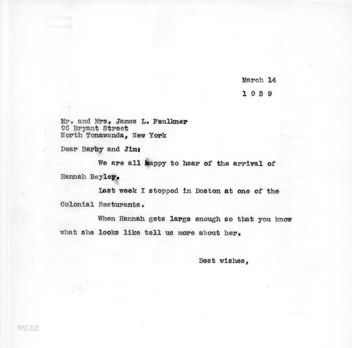 [036] March 14, 1939. To “Barby and Jim [Faulkner]” from [unsigned]. “We are all happy to hear of the arrival of Hannah Bayley.” Mentions stopping at one of the Colonial Restaurants in Boston.