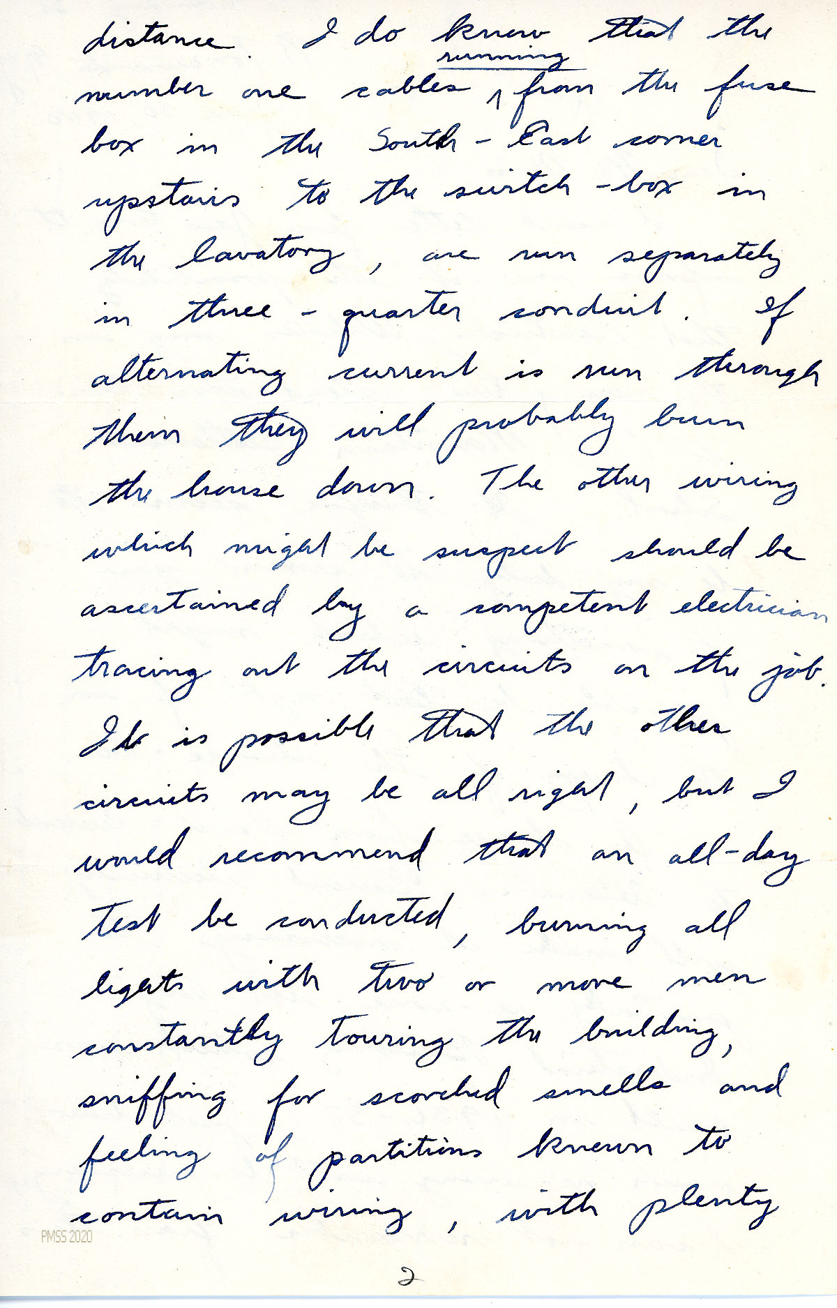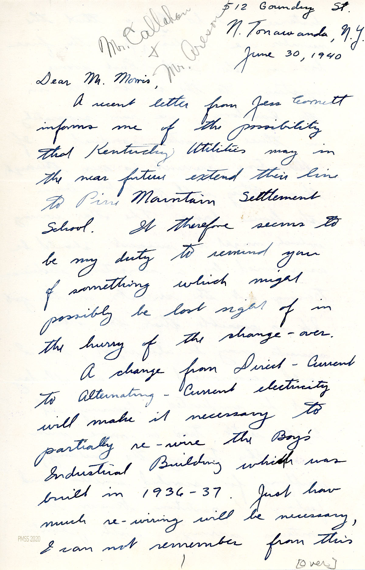[037] through [039] June 30, 1940. Handwritten three-page letter to Morris from Faulkner, N. Tonawanda, NY, [037] who has read in a letter from Jess Cornett that Kentucky Utilities may extend their line to PMSS. If so, he sends a reminder that to avoid a fire, “a change from direct-current to alternating-current electricity will make it necessary to partially the re-wire Boys’ Industrial Building which was built in 1936-37.” [038] Describes the wiring of the cables and suggests testing by a competent electrician. [039] He and Barby send their regards to the Morrises, Callahans, and the Angels.