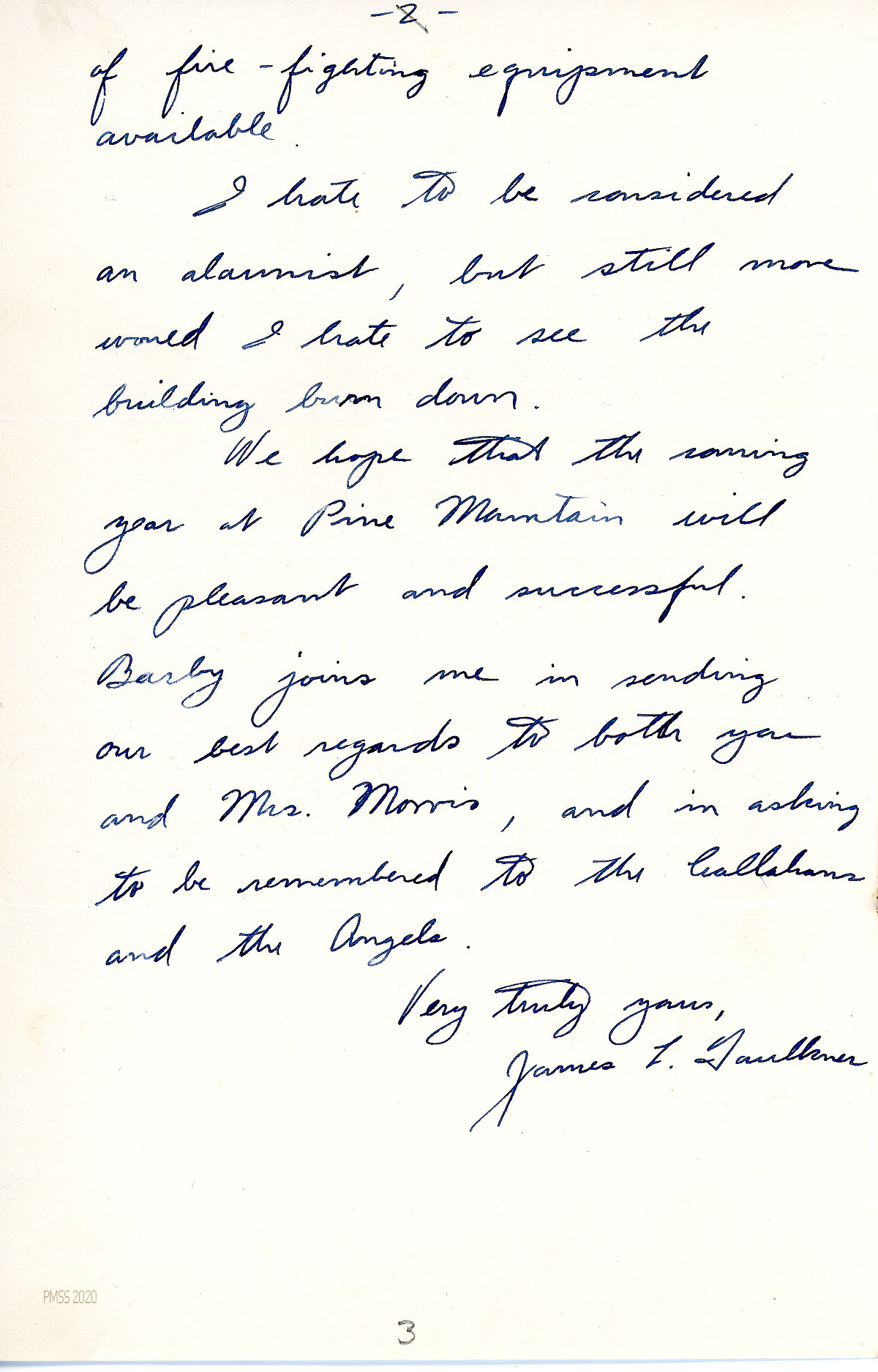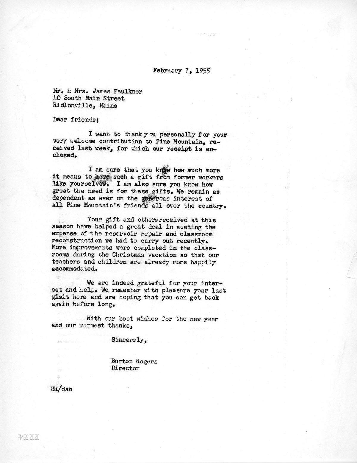 [044] February 7, 1955. To “friends” (Mr. and Mrs. James Faulkner) in Ridlonville, Maine, from Burton Rogers, Director, thanking them for their contribution to Pine Mountain. This season’s gifts will help with the expenses of the reservoir repair and classroom reconstruction. “We remember with pleasure your last visit here….”