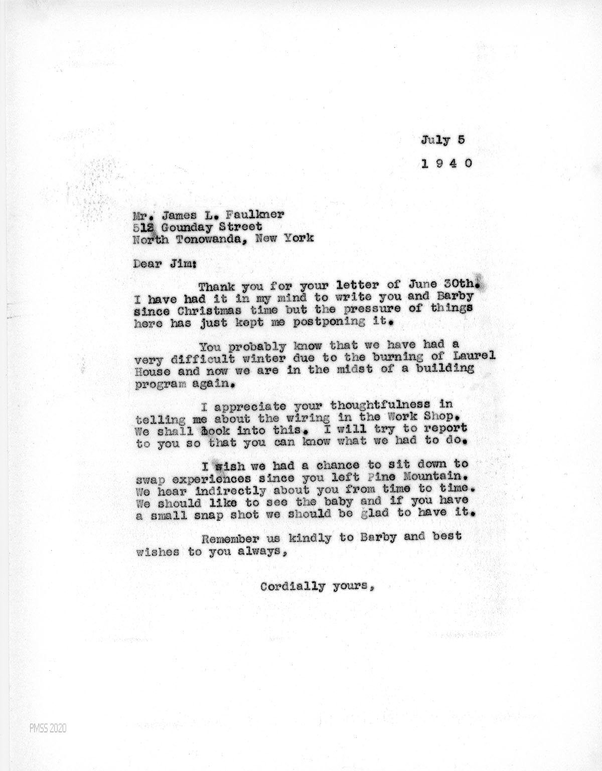 [040] July 5, 1940. To Faulkner from [unsigned], who tells of the burning of Laurel House; appreciates his describing the wiring in the Work Shop.