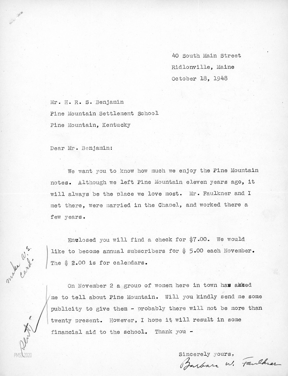 [042] October 18, 1948. Typewritten letter to H.R.S. Benjamin from Barbara W. Faulkner in Ridlonville, Maine. Enjoys PMSS Notes. “Although we left Pine Mountain eleven years ago, it will always be the place we love most. Mr. Faulkner and I met there, were married in the Chapel, and worked there a few years.” Encloses a check for an annual subscription and a calendar. Asked for PMSS publicity to hand out at a talk she will be giving to a women’s group.