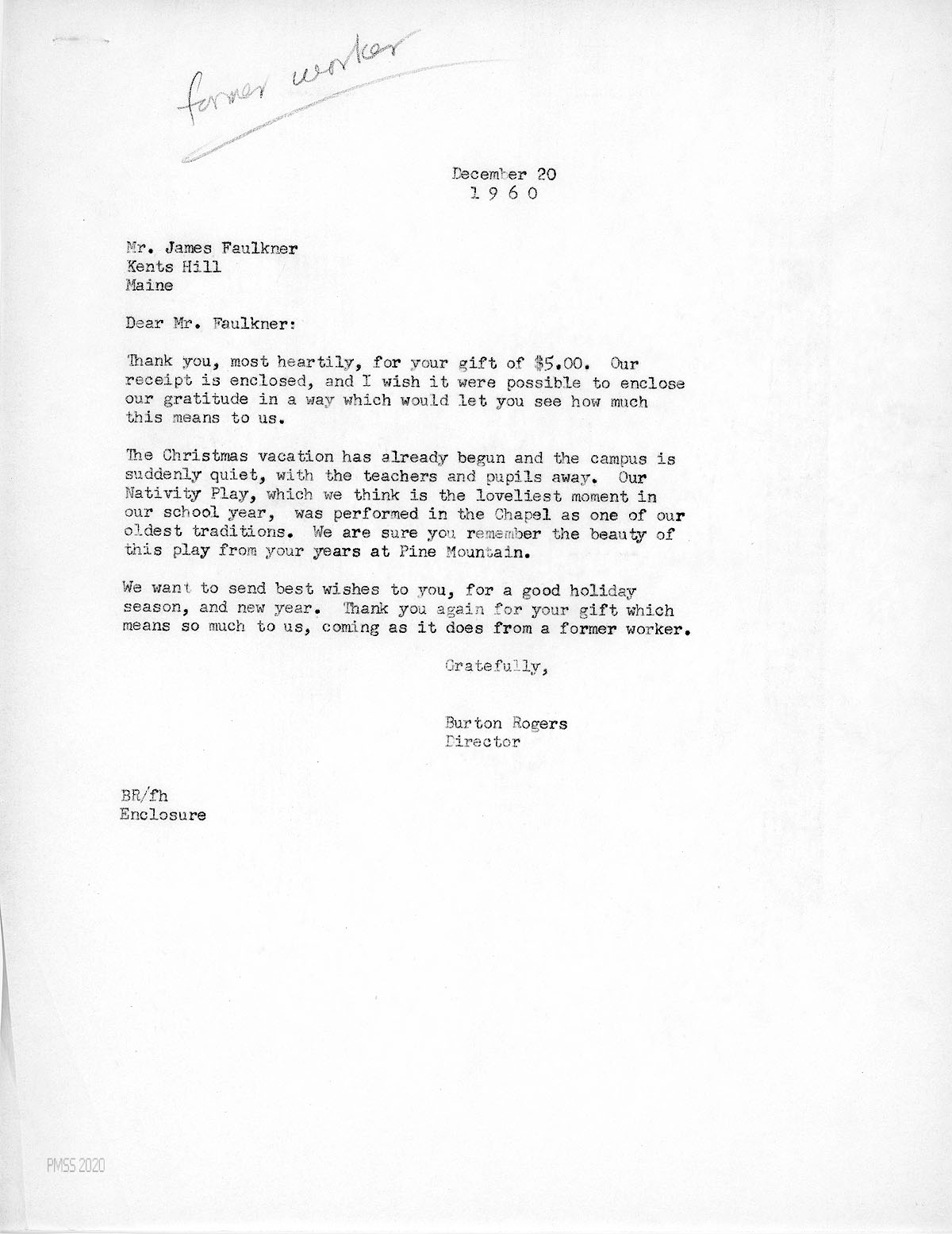 [045] December 20, 1960. To James Faulkner, Kents Hill, Maine, from Burton Rogers, thanking him for his gift; mentions performance of the Nativity Play.
