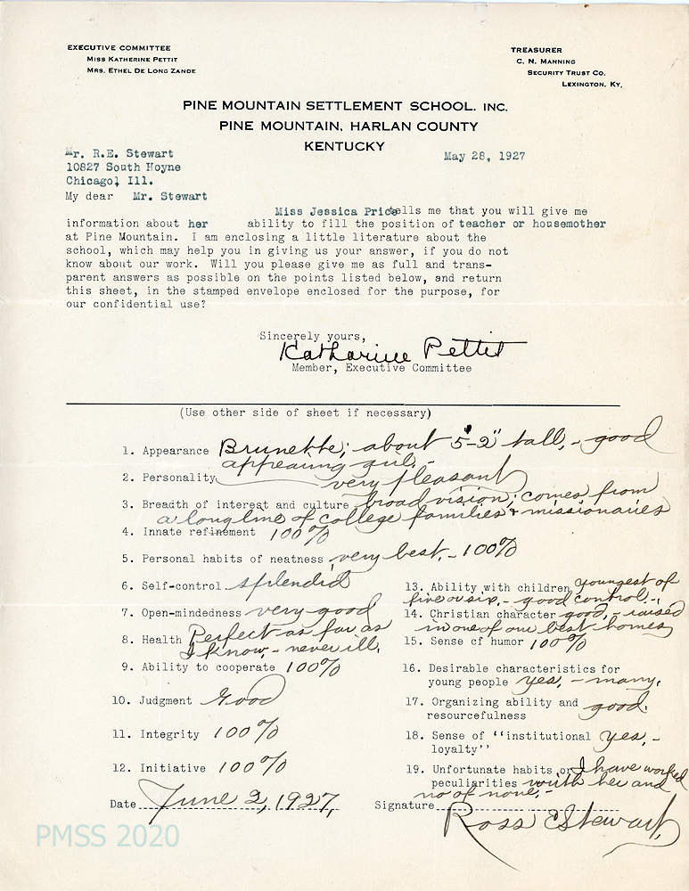[002] June ?, 1927. To Katherine Pettit of the PMSS Executive Committee from Miss Deborah Canon, Westport, NY. Canon provides handwritten entries on a two-sided form (sent to her by Pettit on May 28) concerning Jessica’s ability to fill a teacher or housemother position at PMSS.