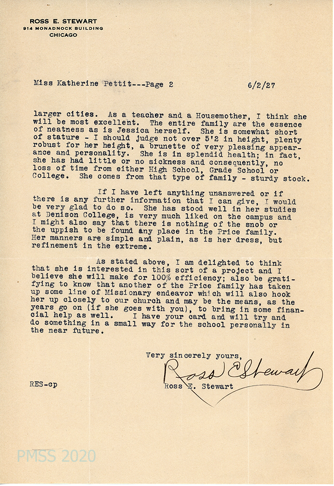 [006], [006a] June 2, 1927. Two-page typewritten letter to Miss Katherine Pettit from Ross E. Stewart, Chicago, IL, [006] who encloses his reference form for Jessica. “She comes from a long line of college educated families on both sides and also from a long line of missionary families.” He tells of her family’s longtime association with Denison College; that she is the youngest of six children. “We have no finer family in the Morgan Park Baptist Church than the Price[s]. They have been in Morgan Park for very, very many years….” Just before college, Jessica was president of the Baptist Young Peoples’ Union (BYPU) and that year was “one of the best in the history of BYPU work. She has splendid executive ability, is a good planner, keeps her mind on her work….” [006a] “Her manners are simple and plain, as is her dress, but refinement in the extreme.”