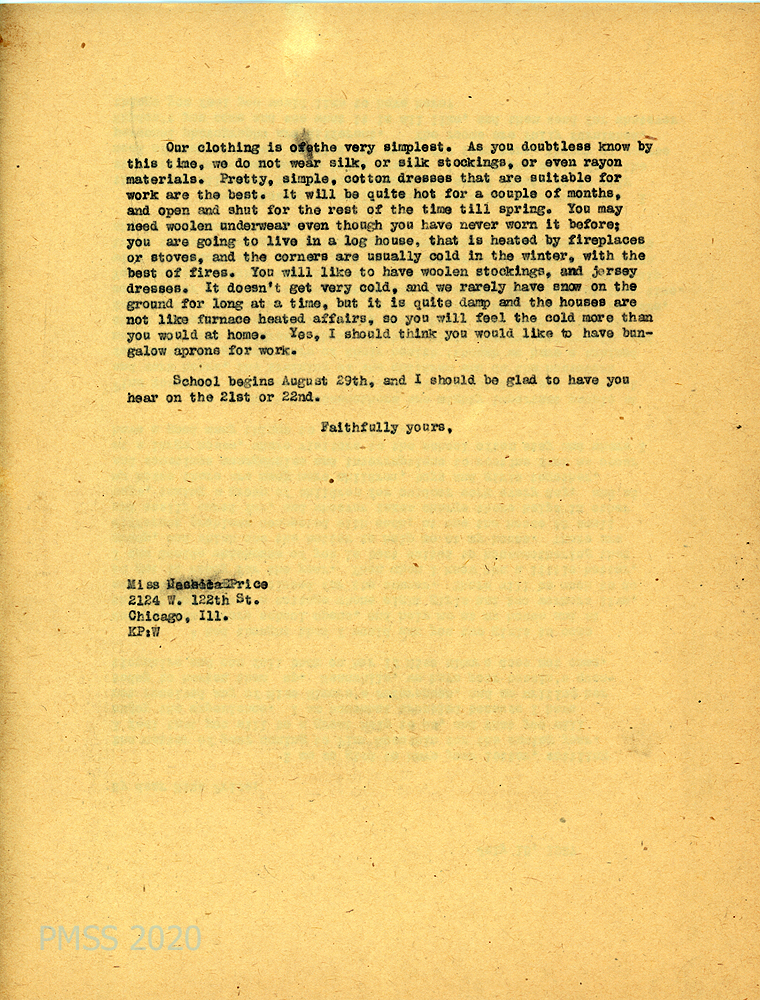 Pettit encloses travel directions; rooms are fully furnished. [013a] Describes the weather and the kind of clothing to bring. “Yes, I should think you would like to have bungalow aprons for work.”