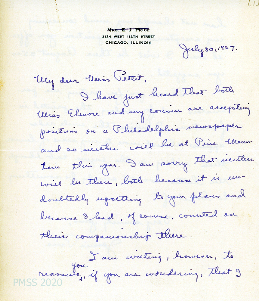 [014] July 30, 1927. To Pettit from Price. Miss Elmore and Jessica’s cousin have accepted positions at a Philadelphia newspaper and won’t be coming to PMSS. [014a] Assures Pettit she will arrive at PMSS on August 22.