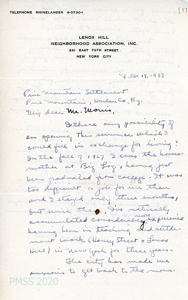 [018], [018a] February 19, 1933. To Mr. [Glyn] Morris from Price on letterhead for Lenox Hill Neighborhood Association, Inc., NYC. [018] Price asks about summer employment; explains her previous PMSS work. “It was too difficult a job for me then and I stayed only three months, but since then, I’ve naturally accumulated considerably more experience having been in teaching and settlement work (Henry Street & Lenox Hill) in New York for three years. The city has made me anxious to get back to the mountains [018a] for a season. I loved it the short while I was there and have often wanted to return.” Describes her work at Lenox Hill as director of pottery and at Henry Street where she made a creche that Ruth Campbell sent to PMSS. Mentions another worker who is interested in PMSS summer work.