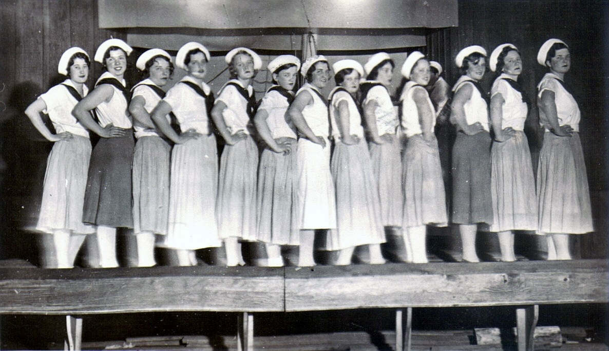 - Women’s Chorus in “H.M.S. Pinafore,” 1933. Members: Luvilla Ison, Jewel Rainey, Joan Ayers, Alberta Creech, Herma Frazier, Elizabeth Mitchell, Bessie Woodward, Bertie Wilson, Susie Hall, Allene Maliccat, Polly Turner, and Della Turner. [pmss_susie_pinafore chorus.jpg]