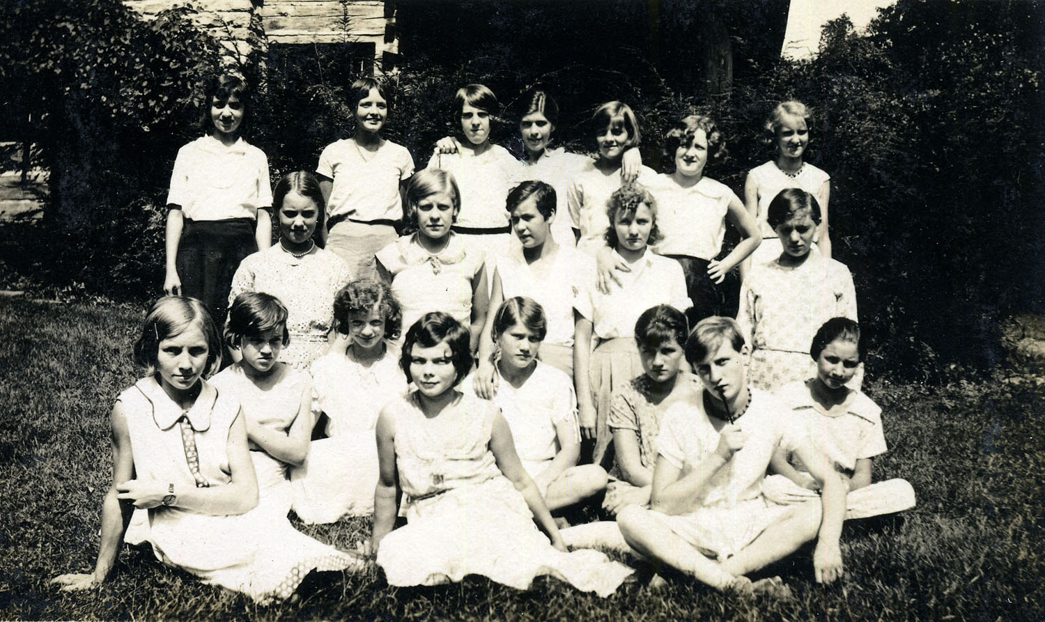 - 07_2453 PMSS students. (top row) ?, Mabel Hall, ?, ?, ?, ?, Joan Ayers. (2nd row) ?, ?, ?, ?, ?. (front row) Alene Malicoat, Alma Bird, ?, ?, ?, ?, ?, ?. [098_IX_students_07_2453_001.jpg]