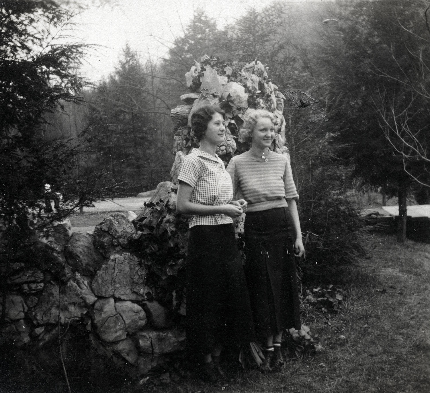 Joanna Ayers (right) and Elizabeth Mitchell at Creech Fountain, late 1930s. [098_IX_students_09_2459_003]