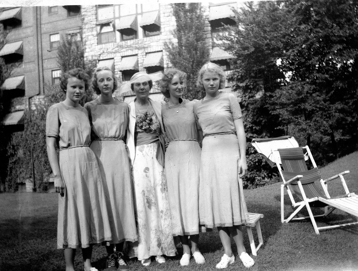- Girls Octet on tour at Excelsior Springs, Missouri, 1938. Part of Octet: Ruby Ayers, Fern Hall, ?, Joan Ayers, Lucille Christian. [III_campus_life_0793.jpg]