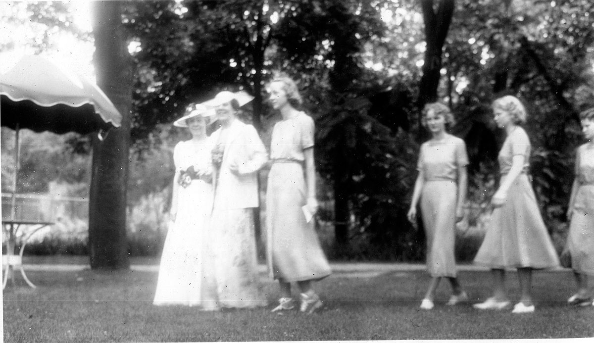 - Girls Octet on tour at Excelsior Springs, Missouri, 1938. Part of Octet from left; Lucille Christian, Ruby Ayers, ?, ? . [III_campus_life_0793b.pg]