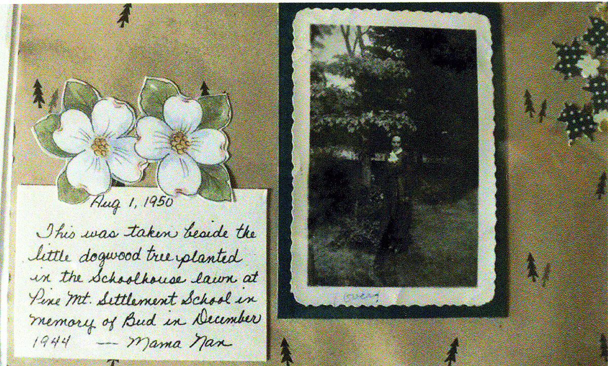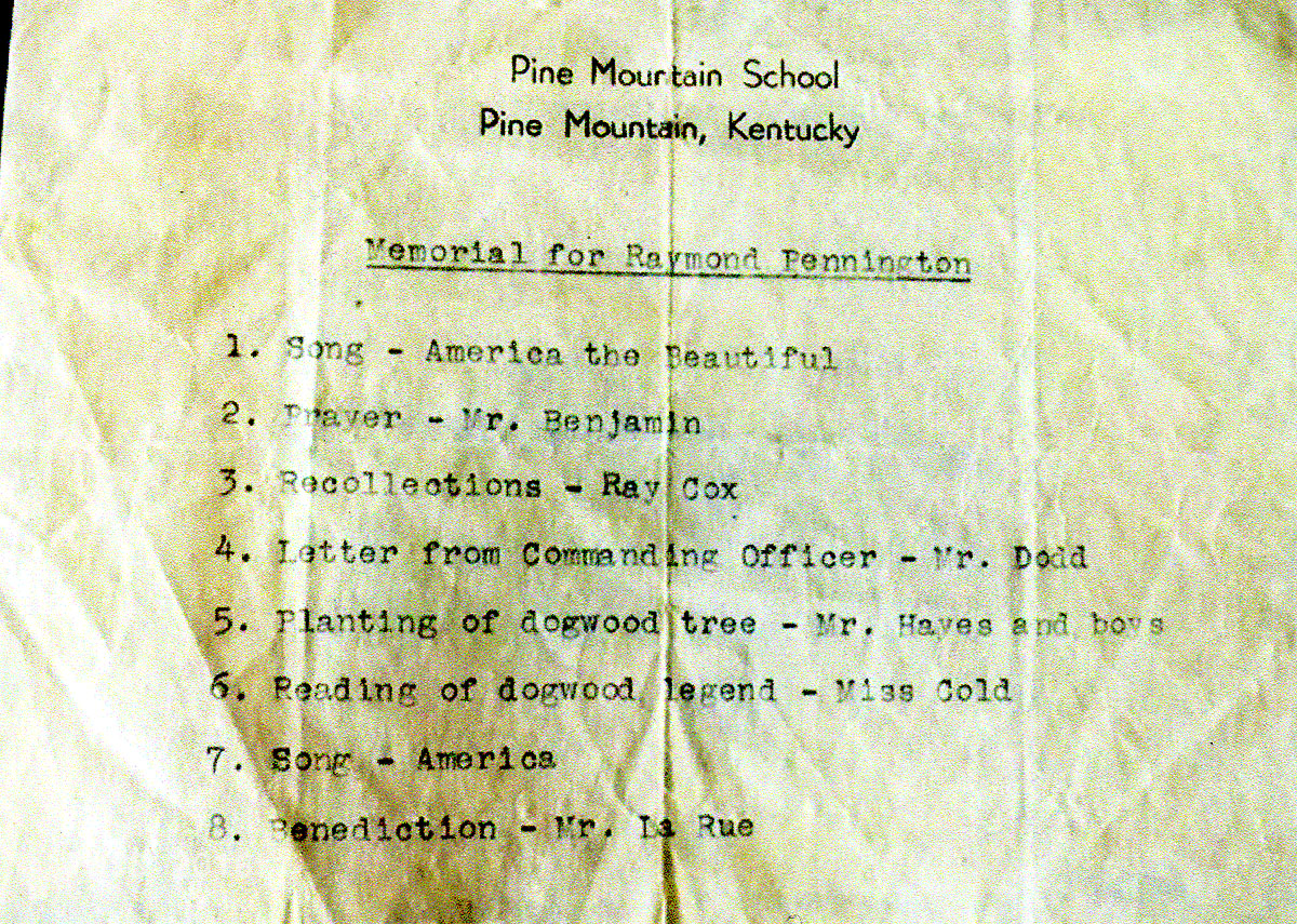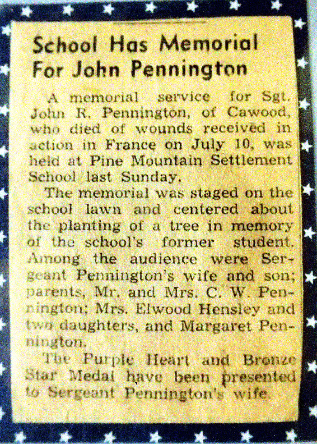 John Raymond Pennington, also known as “Bud,” was a boarding student at Pine Mountain Settlement School in 1935-1938. Like many PMSS students and alumni he joined the war effort. He was wounded seriously in the war and later died on July 10, 1944. He was memorialized just shortly after his death with the planting of a dogwood tree on the grounds of Pine Mountain Settlement near the location of the Burkham School House. His wife, his young son, his parents, Mr. and Mrs. C.W. Pennington, Mrs. Elwood Hensley and two daughters, and Margaret Pennington were present for the memorial.