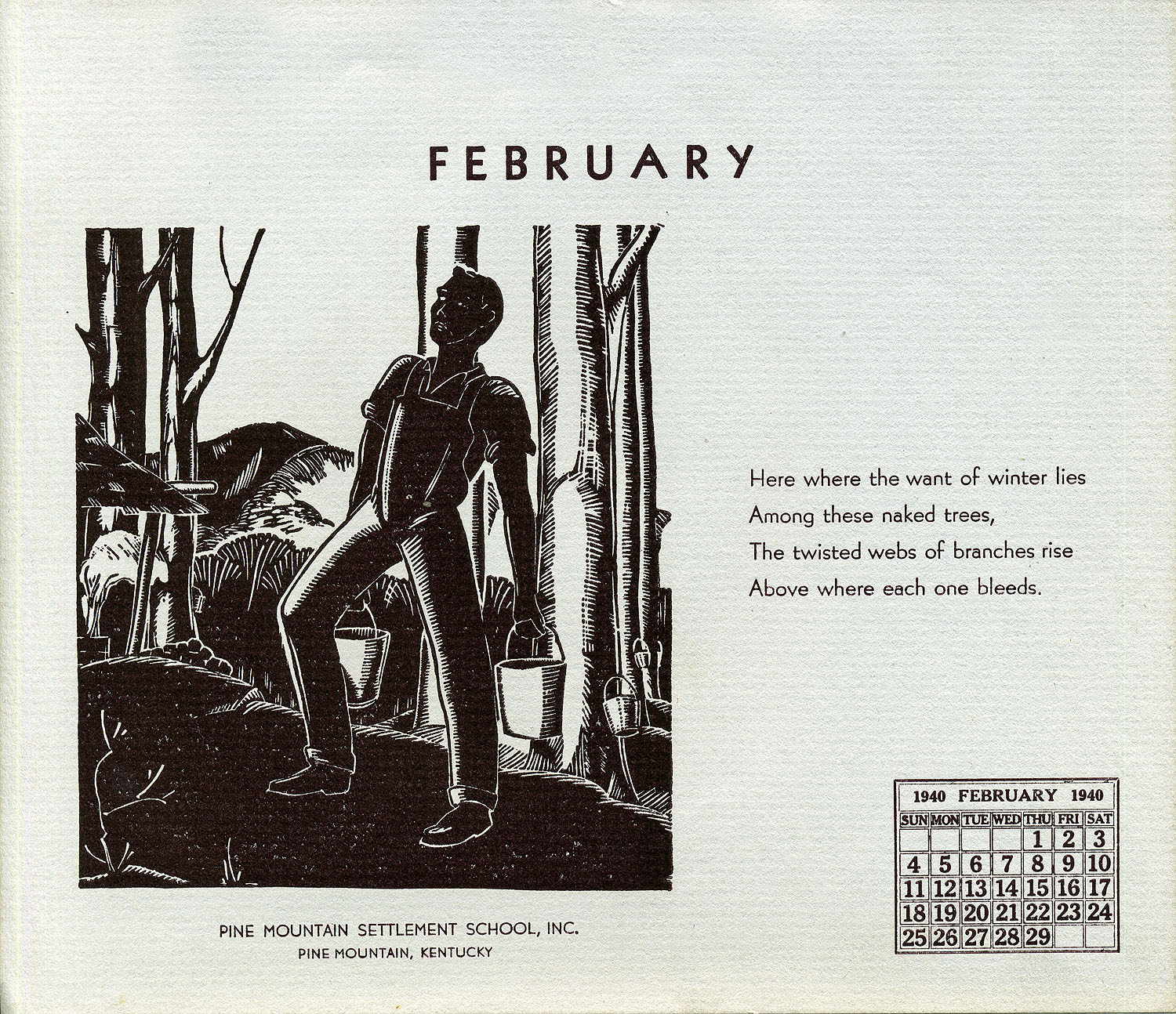 I have received a number of calendars from the Pine Mountain Settlement School. This school in Harlan County, Kentucky, is devoted to the education of mountain children. I am delighted with the linoleum cuts which have been used in making up this calendar. Mr. John A. Spelman III made them and he has chosen to portray scenes from the mountain environment and has done it delightfully. The students set up the pages and printed them.