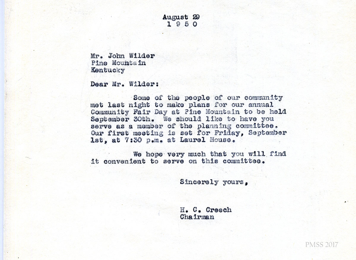 Some of the people of our community met last night to make plans for our annual Community Fair Day at Pine Mountain to be held September 30th. We should like to have you serve as a member of the planning committee. Our first meeting is set for Friday, September 1st, at 7:30 p.m. at Laurel House.