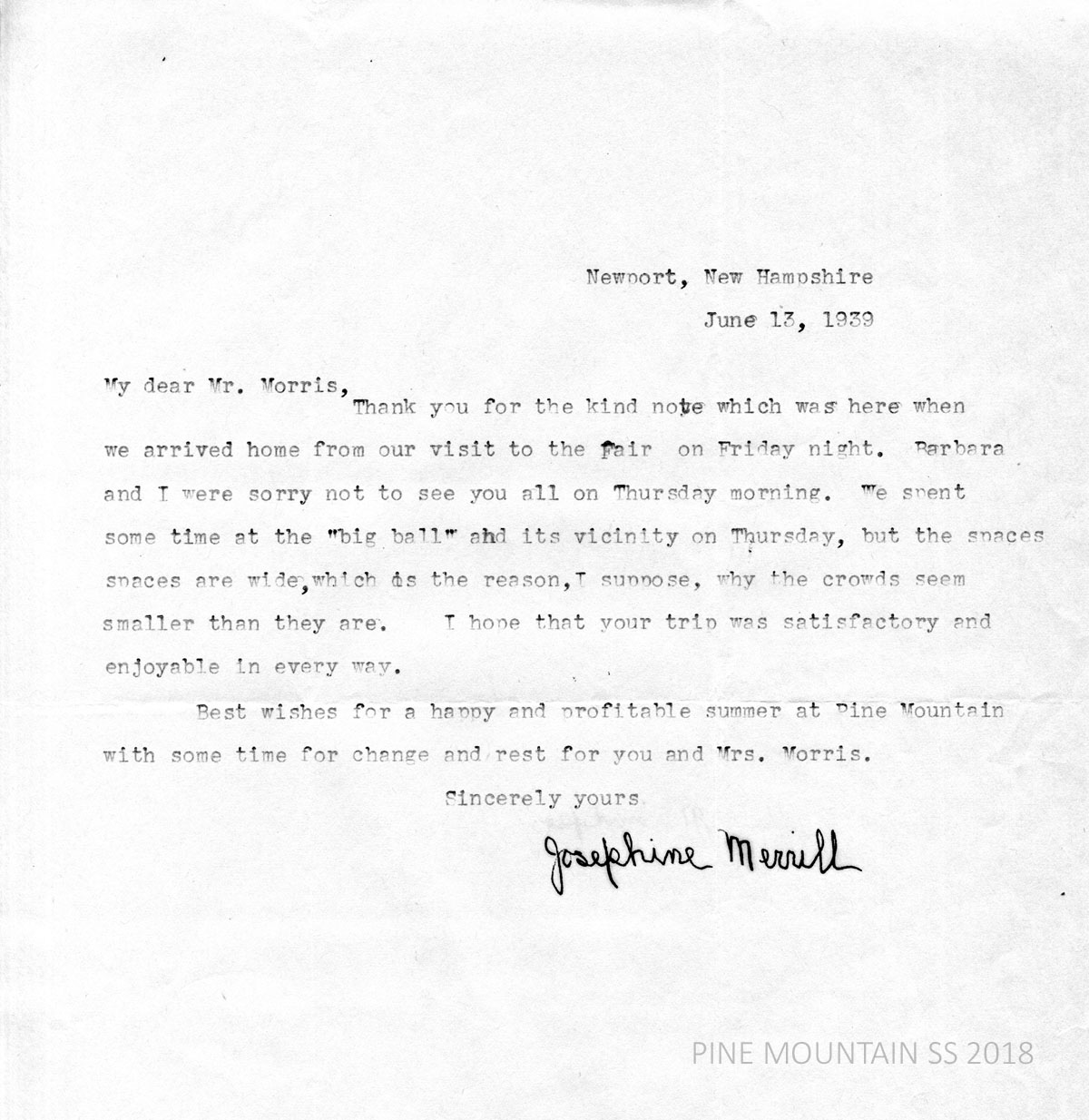067 June 13, 1939. To Glyn A. Morris, Director, from Josephine M. Merrill. In Newport, NH, thanking him for his note and wishing him “a happy and profitable summer” at PMSS.