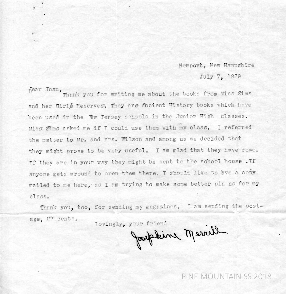 068 July 7, 1939. To “Joan” at PMSS from Josephine Merrill in Newport, NH, thanking her for telling her of the arrival of the history books donated to PMSS by Miss Sims and her Girl Reserves. The books had been used by New Jersey Schools in Junior High classes. Merrill would like to be sent a copy to use for her lesson plans.
