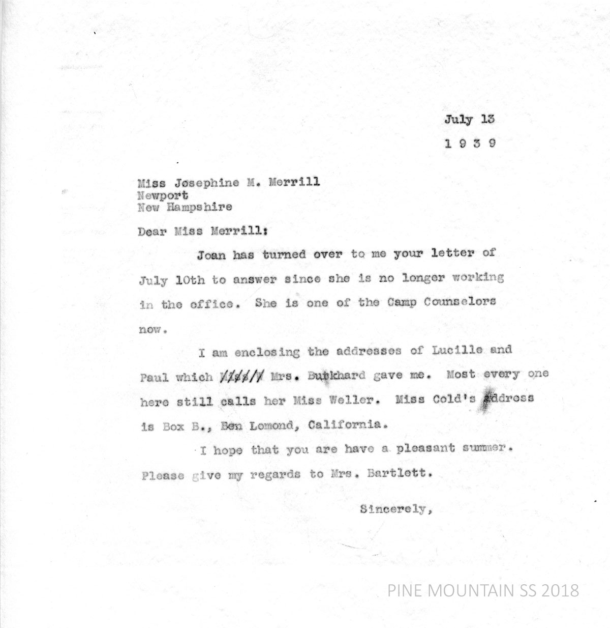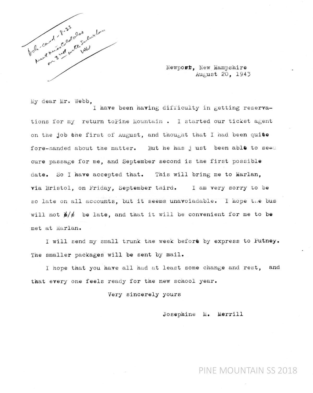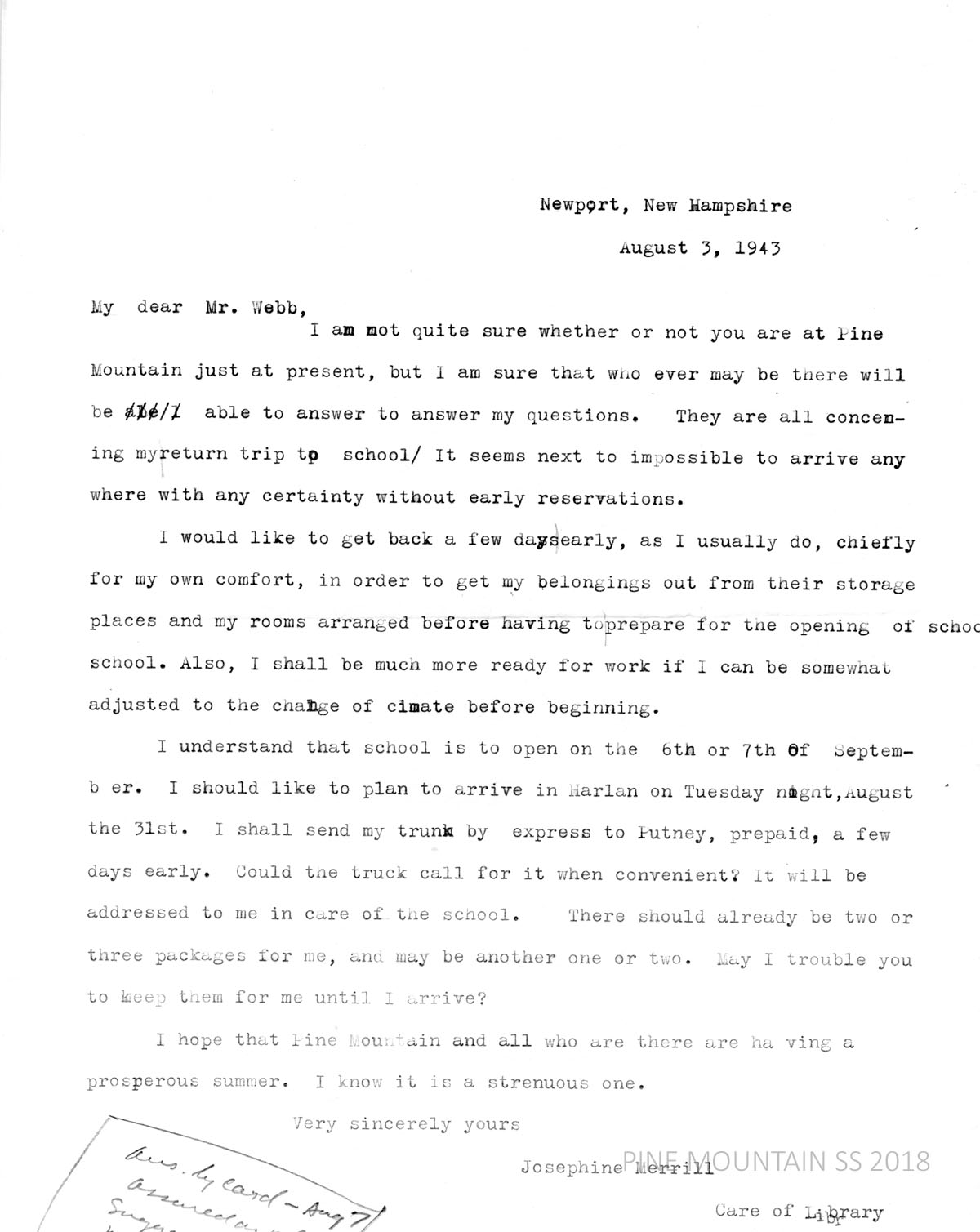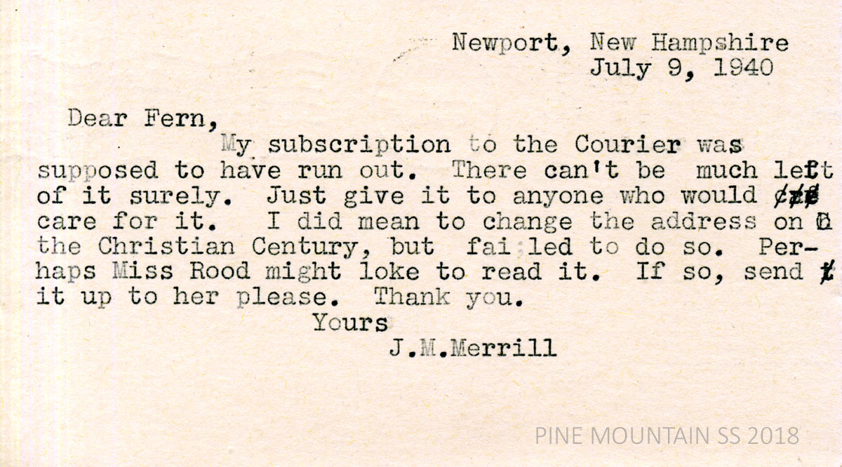 Most of Josephine Merrill’s letters in the PMSS Collections, written during the years 1939-1948, were sent to PMSS staff while she was on summer vacations in Newport, New Hampshire, where she stayed with her sister, Barbara Merrill Bartlett. The PMSS Collection’s letters from Josephine Merrill during this time period were typewritten originals.