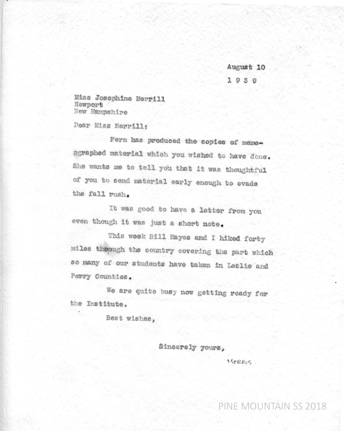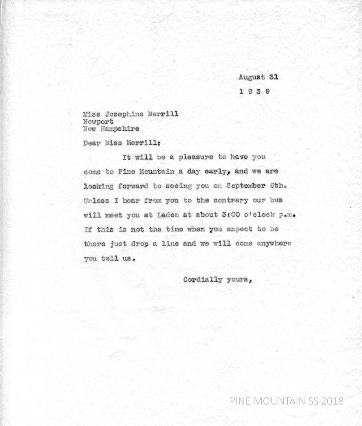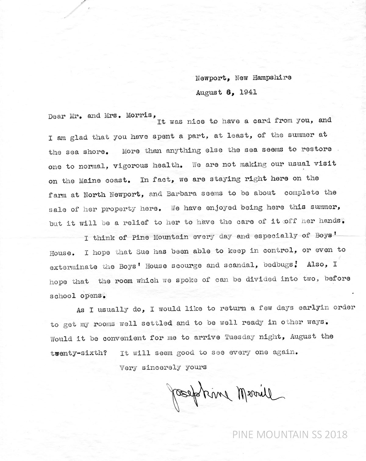 081 August 8, 1941. To Mr. and Mrs. Morris from Merrill. “I think of Pine Mountain every day and especially the Boys’ House.” Her sister, Barbara, is selling her property in New Hampshire.