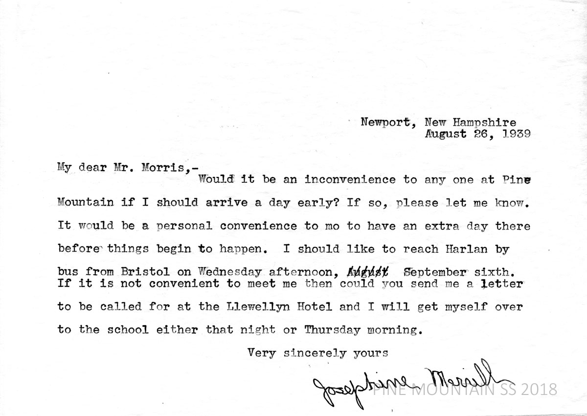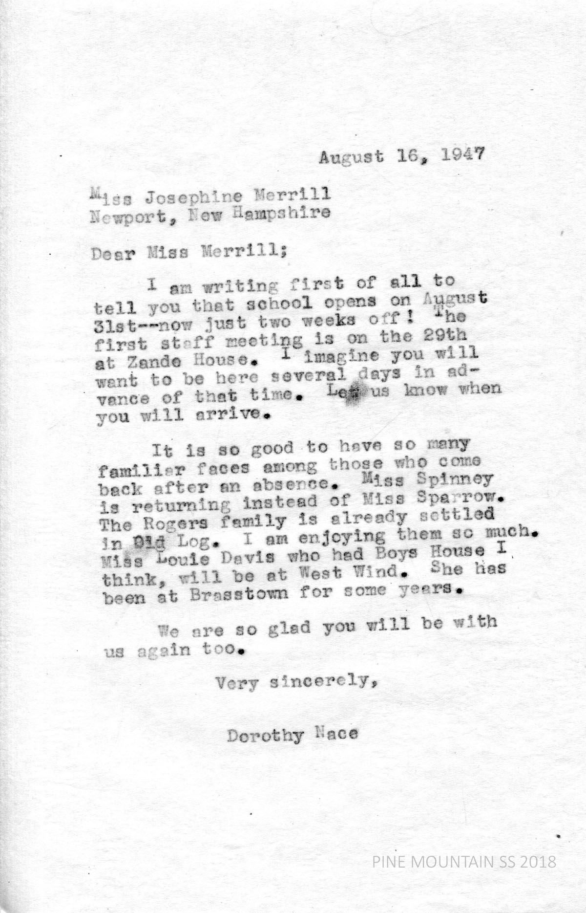 110 August 16, 1947. To Merrill from Dorothy Nace, informing her of the School’s opening date. Miss Spinney is returning instead of Miss Sparrow. The Rogers family is already settled in Old Log. I am enjoying them so much. Miss Louie Davis who had Boys’ House…will be at West Wind. She has been at Brasstown for some years.”