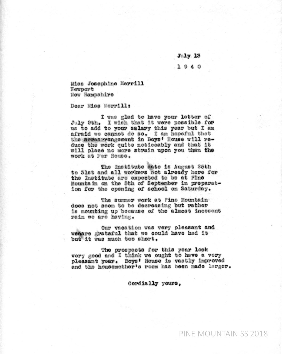 079 July 13, 1940. To Merrill from [unsigned, apparently Morris]. PMSS cannot increase her salary; Her new place at Boys’ Housewill place no more strain upon you than the work at Far House.” He provides dates of the Institute (August 25-31); PMSS workers should arrive by September 5. The housemother’s room in Boys’ House has been enlarged.
