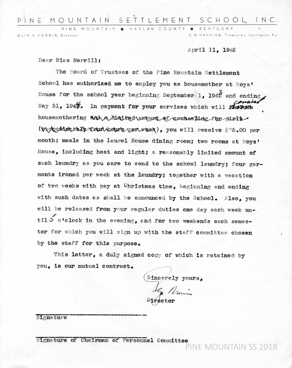 084 April 11, 1942. To Merrill from Morris. Unsigned contract with edits, stating that the Board of Trustees has authorized Morris to hire Merrill as Boys’ House housemother for the 1942-1943 [edited to 1943-1944] school year. Payments: $75.00 per month, meals, two rooms at Boys’ House including heat and light, laundry, ironing, and two weeks’ vacation with pay at Christmas, and time off for staff committee meetings.
