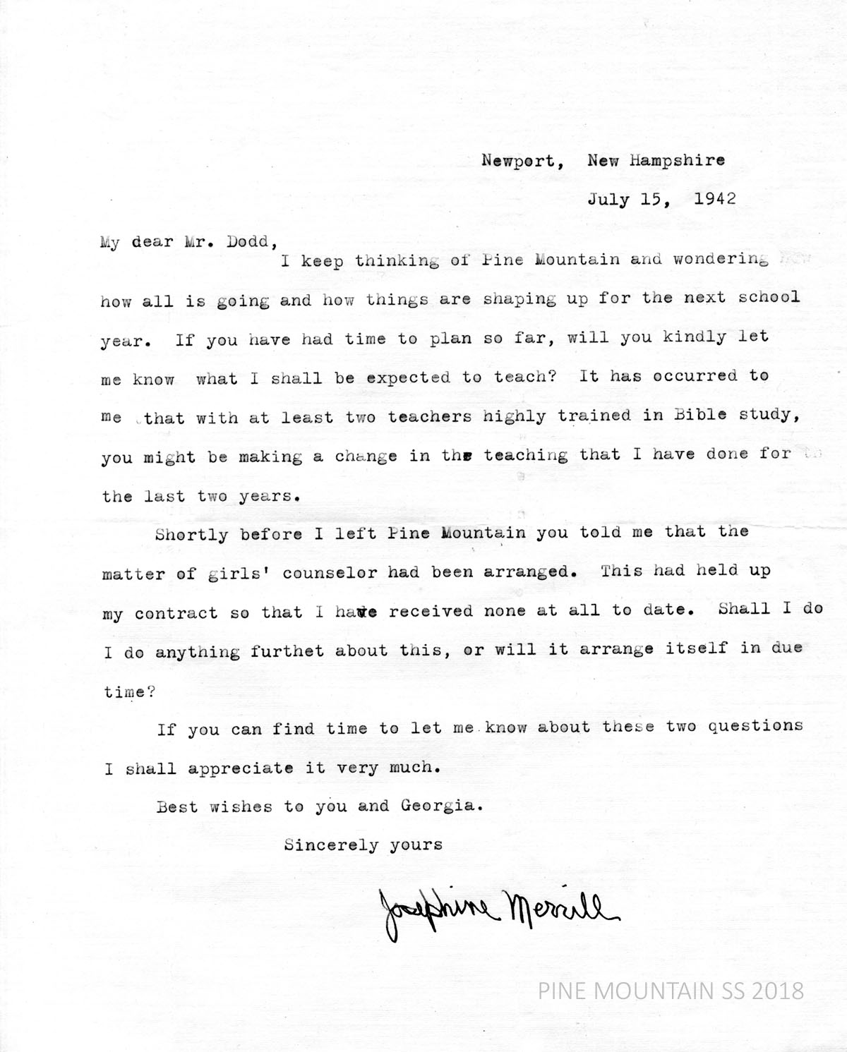 086 July 15, 1942. To Mr. [Arthur W.] Dodd from Merrill in Newport, NH, asking what she will teach during the next school year. “…[W]ith at least two teachers highly trained in Bible study, you might be making a change in the teaching that I have done for the last two years.” She also asks about “the matter of girls’ counselor.”