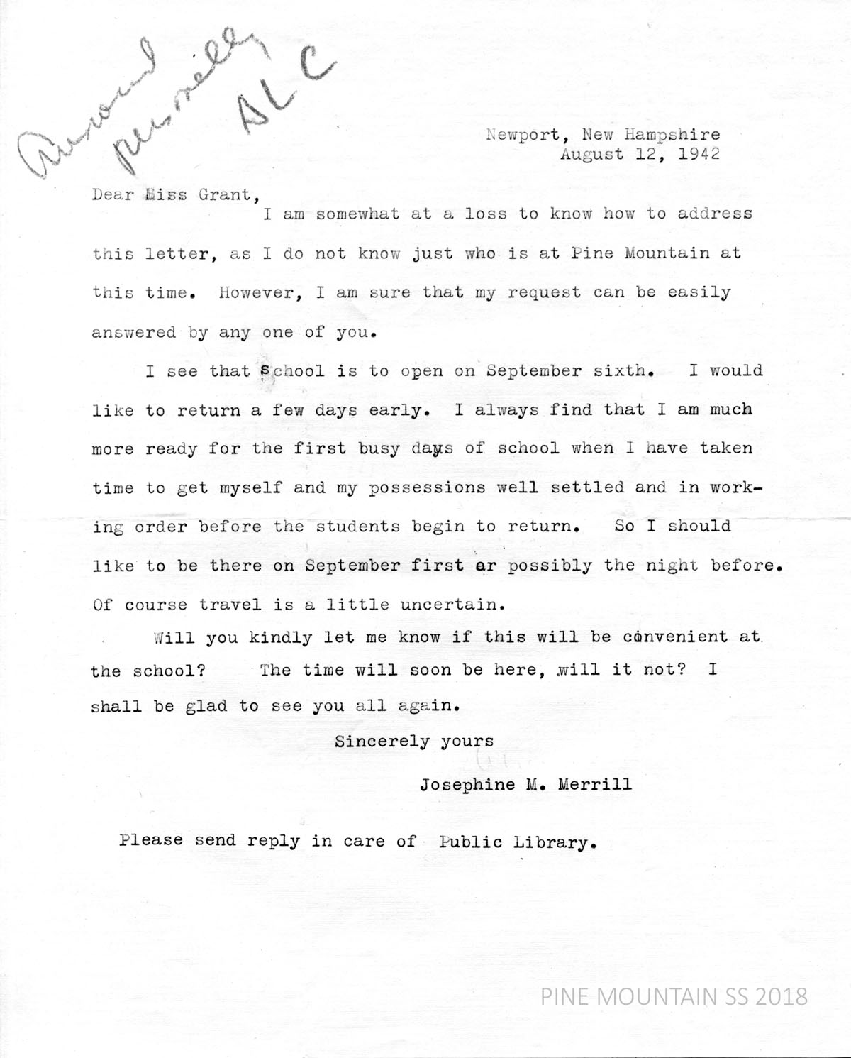 088 August 12, 1942. To Miss Grant from Merrill, asking if she can return five days before the School’s opening date of September 6.