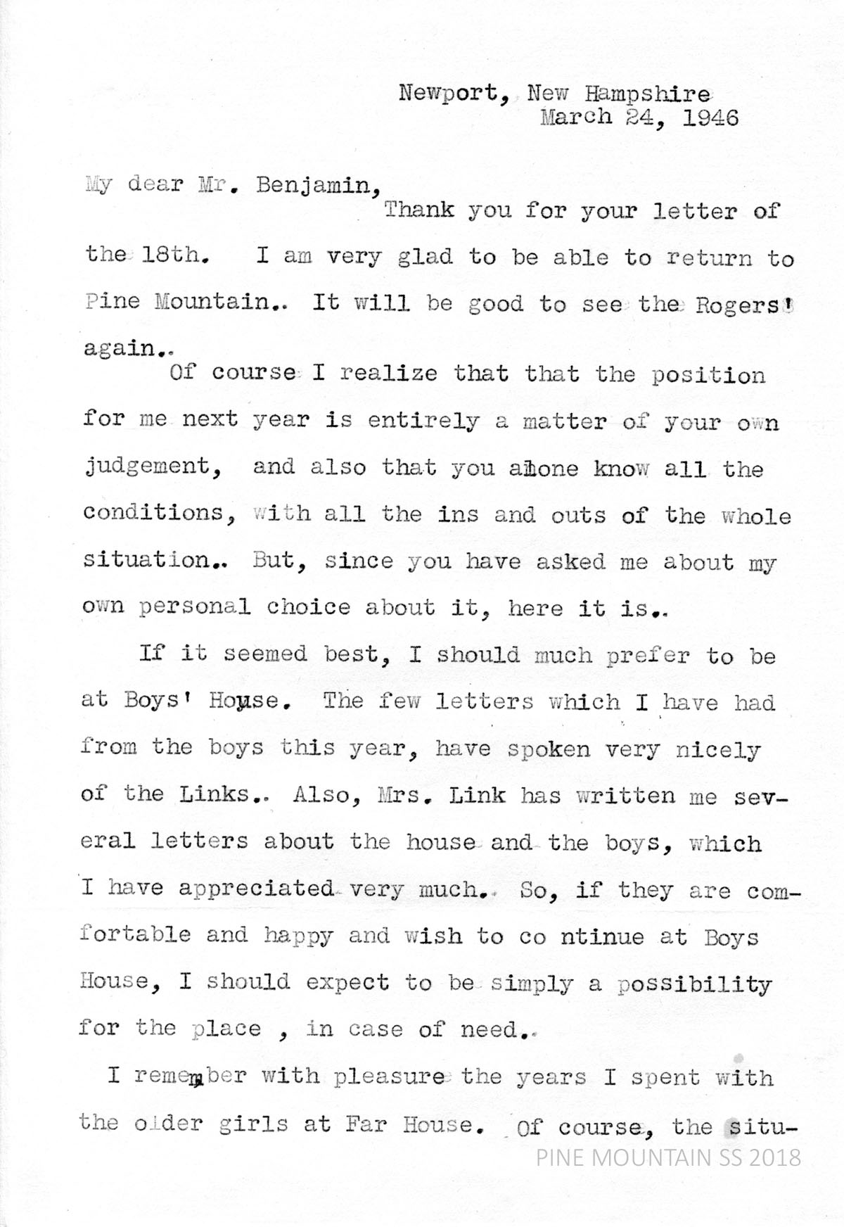 096-096a March 24, 1946. Two-page letter to Benjamin from Merrill in Newport, NH, responding to his question concerning her choice of positions for next year: Boys’ House if Mr. and Mrs. Links do not continue as current houseparents. “I remember with  pleasure the years I spent with the older girls at Far House.” She advises on housing for the incoming housemother.