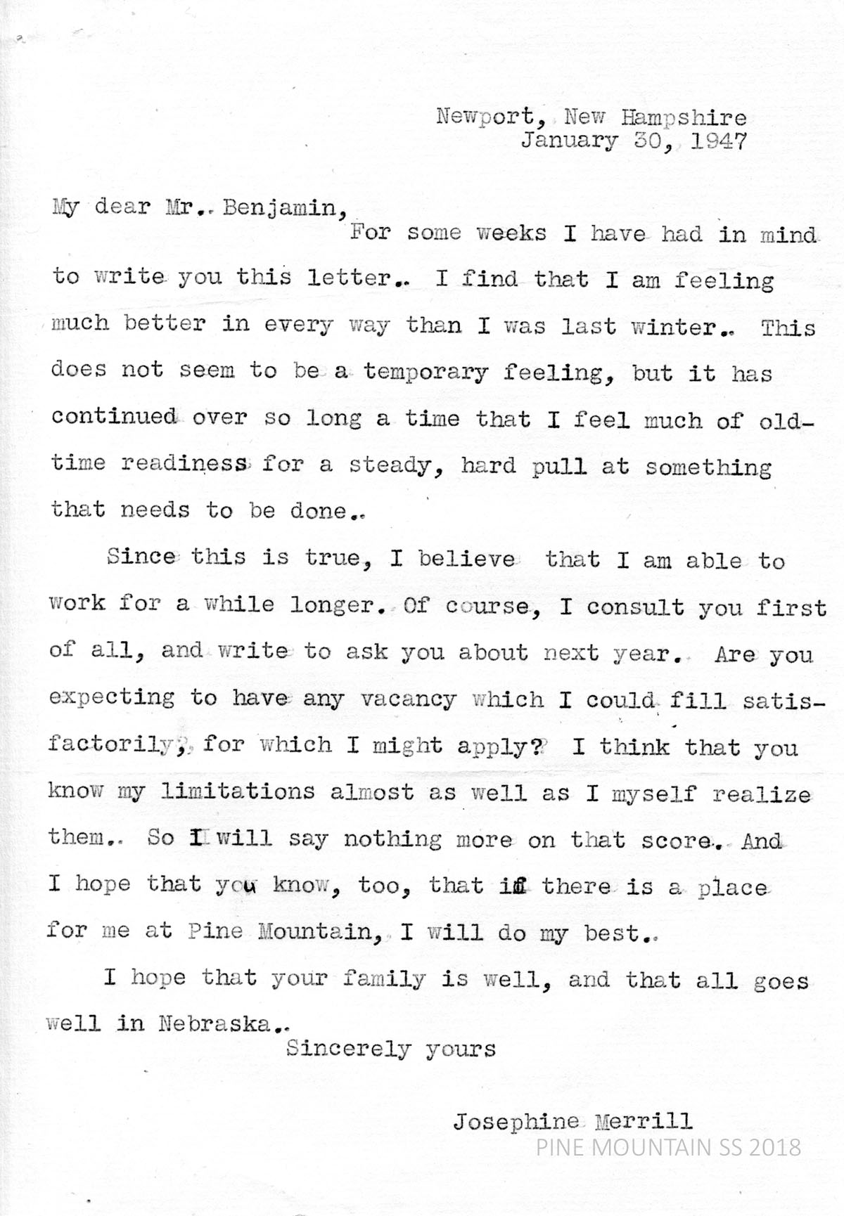 099 January 30, 1947. To Benjamin from Merrill. “…I believe that I am able to work for a while longer.” Merrill asks if PMSS will have any vacancies that she could apply for next year. “I think that you know my limitations…. And I hope that you know, too, that if there is a place for me at Pine Mountain, I will do my best.”