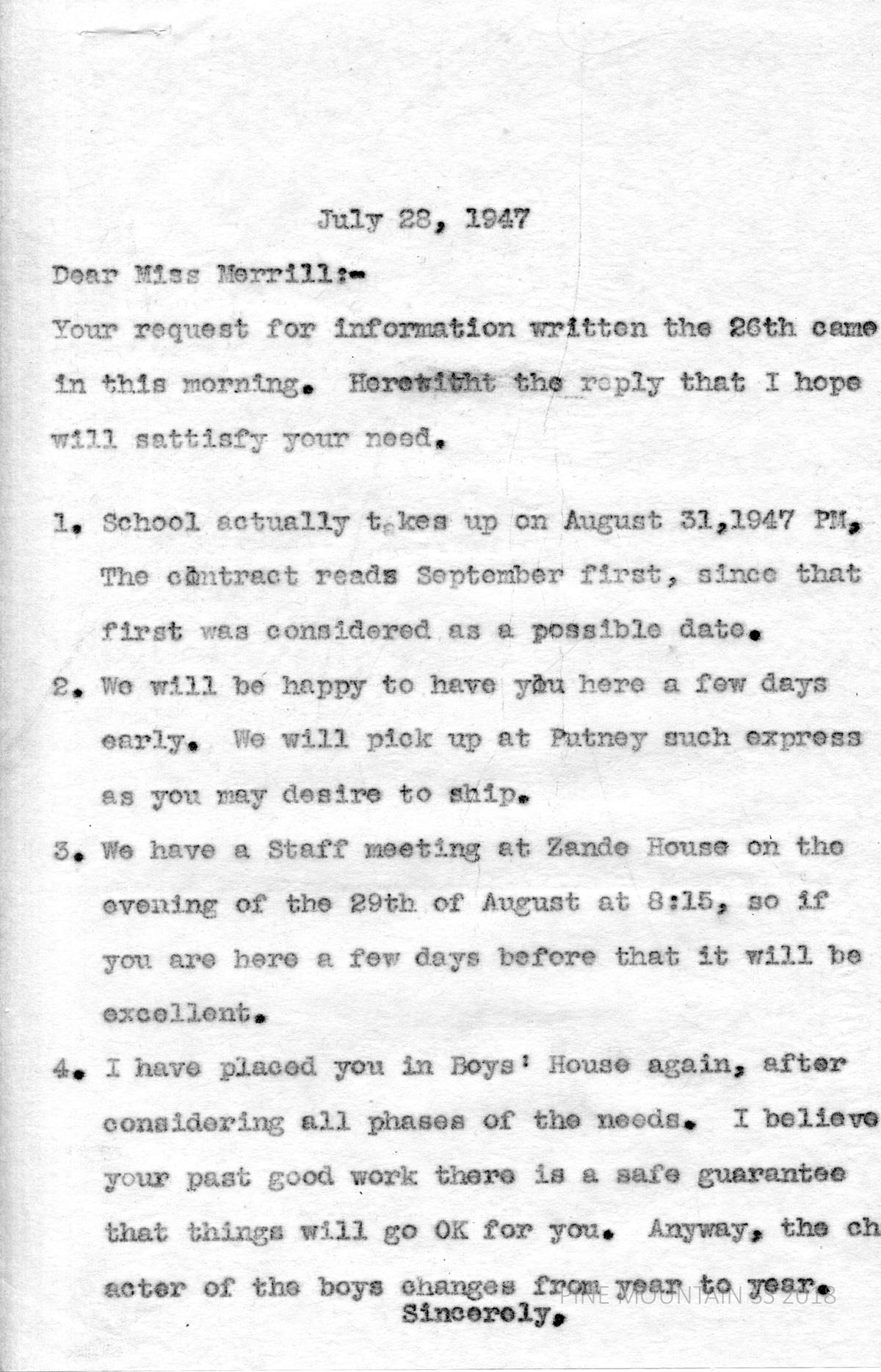 108 July 28, 1947. To Merrill from [unsigned, apparently Benjamin], answering her questions about opening days. She will be at Boys’ House.