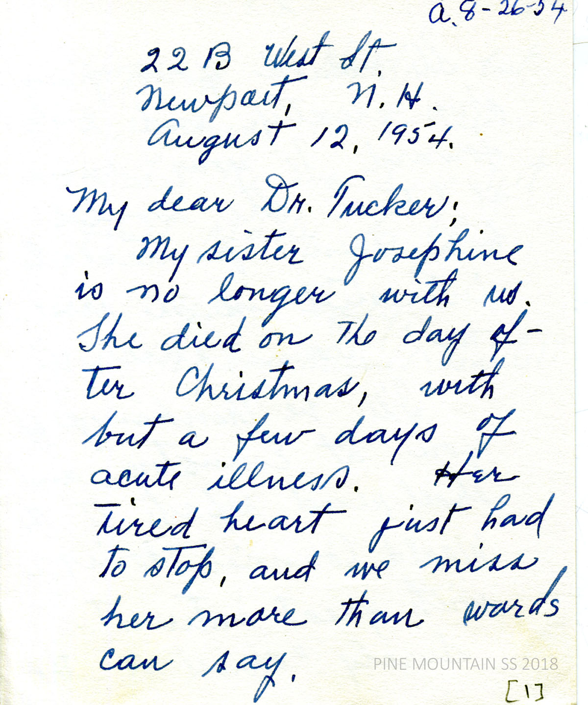 112-113 August 12, 1954. Handwritten letter to “Dr. Tucker” [Dr, Francis Tucker] from Mrs. Barbara Merrill Bartlett in Newport, NH.