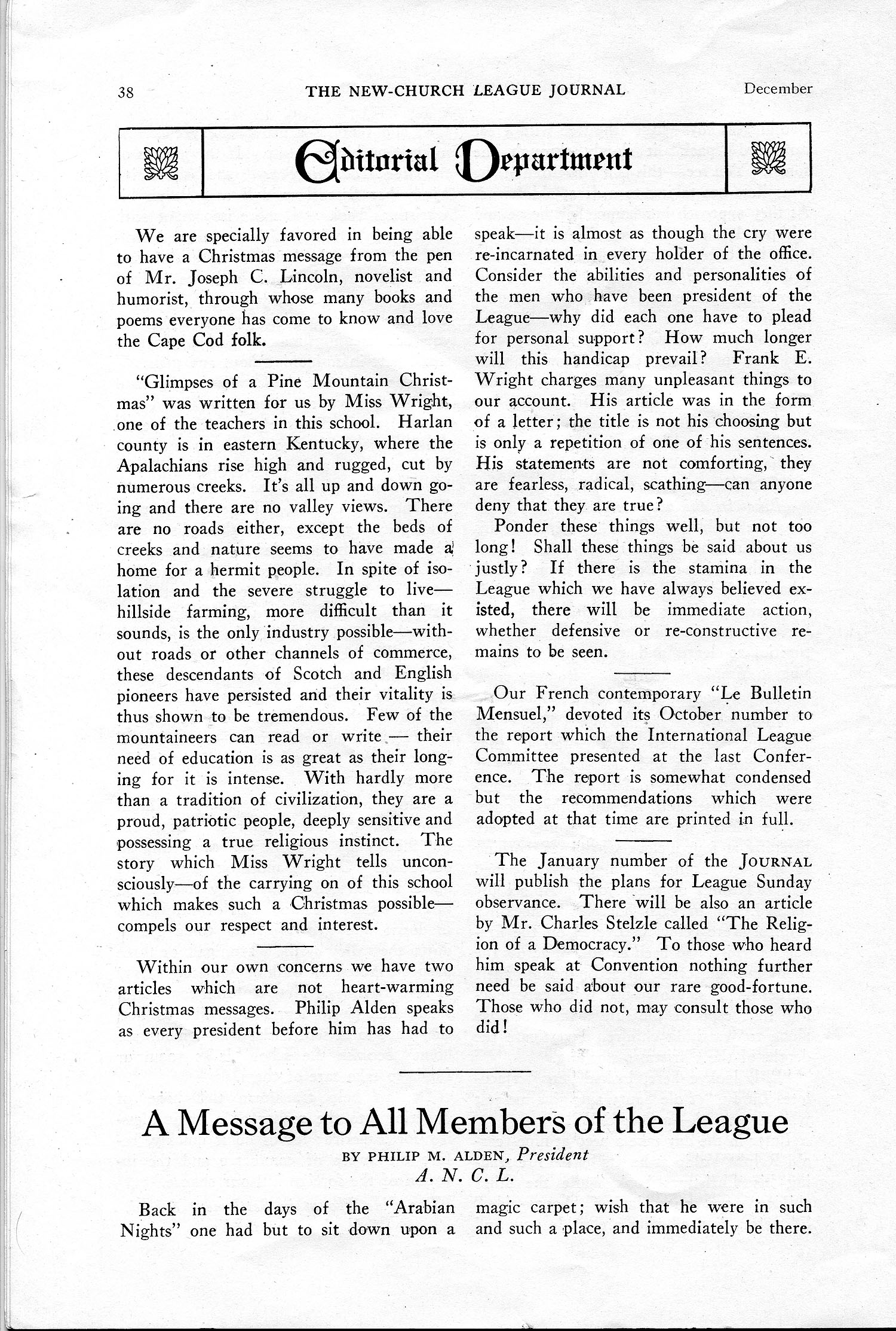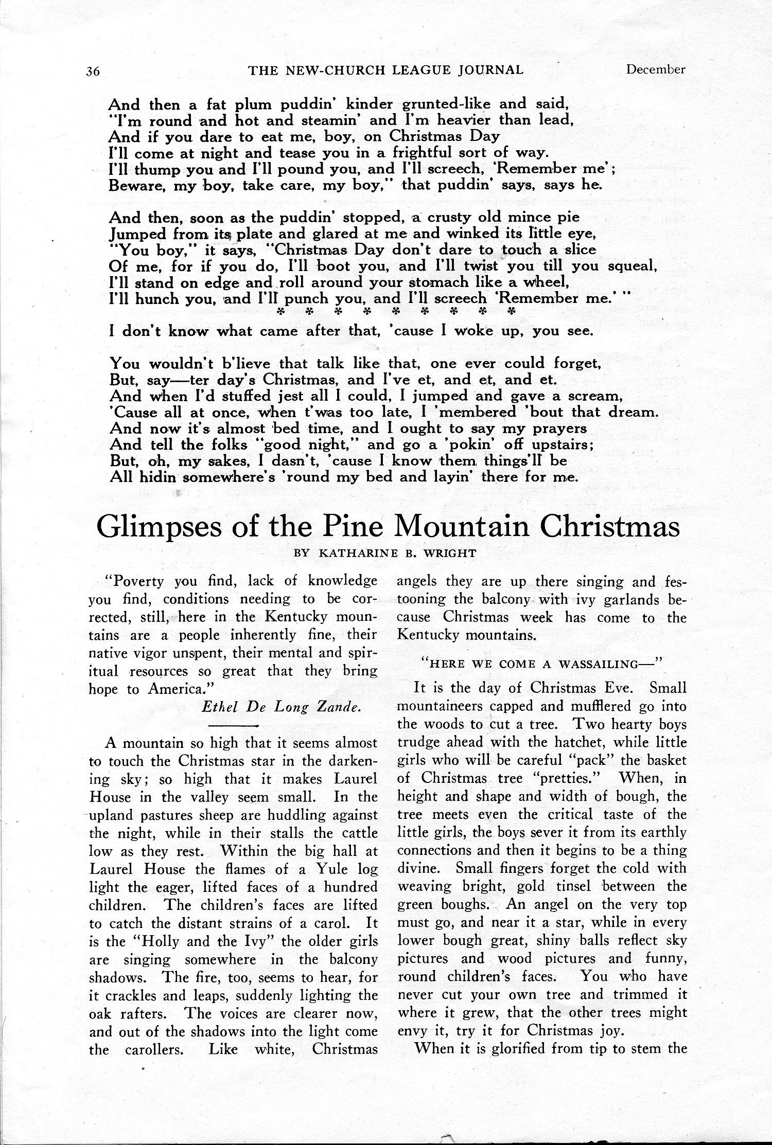 TAGS: Katherine B. Wright, New-Church League Journal, Christmas at PMSS, promotional campaign, Ethel de Long Zande, Nativity Play, Appalachian Mountains