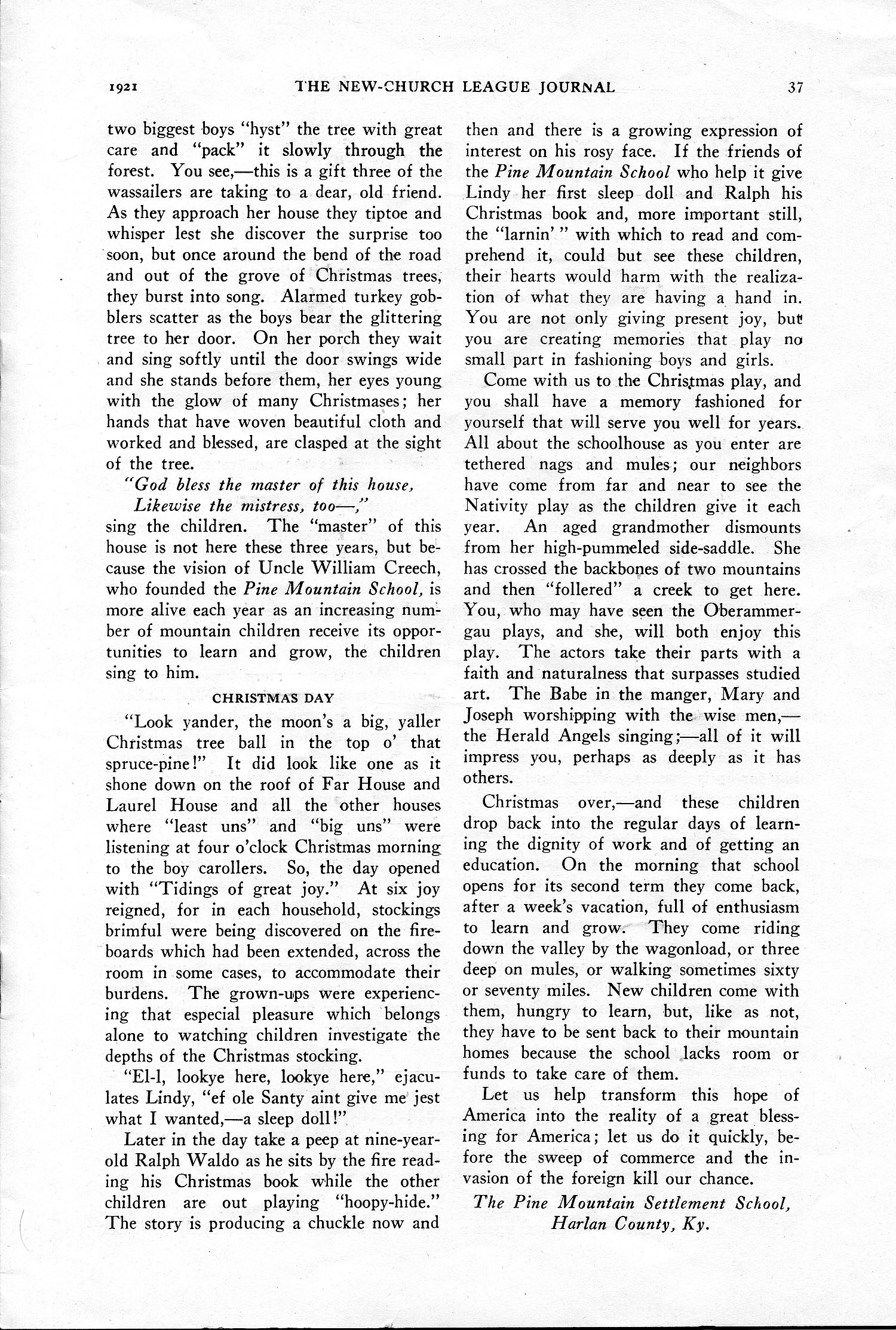 Writing for the international New-Church League Journal, Katherine B. Wright, a Pine Mountain Settlement School worker in the 1920s, captures the activities and more importantly the essence of the Christmas season at Pine Mountain Settlement School in December of 1921.