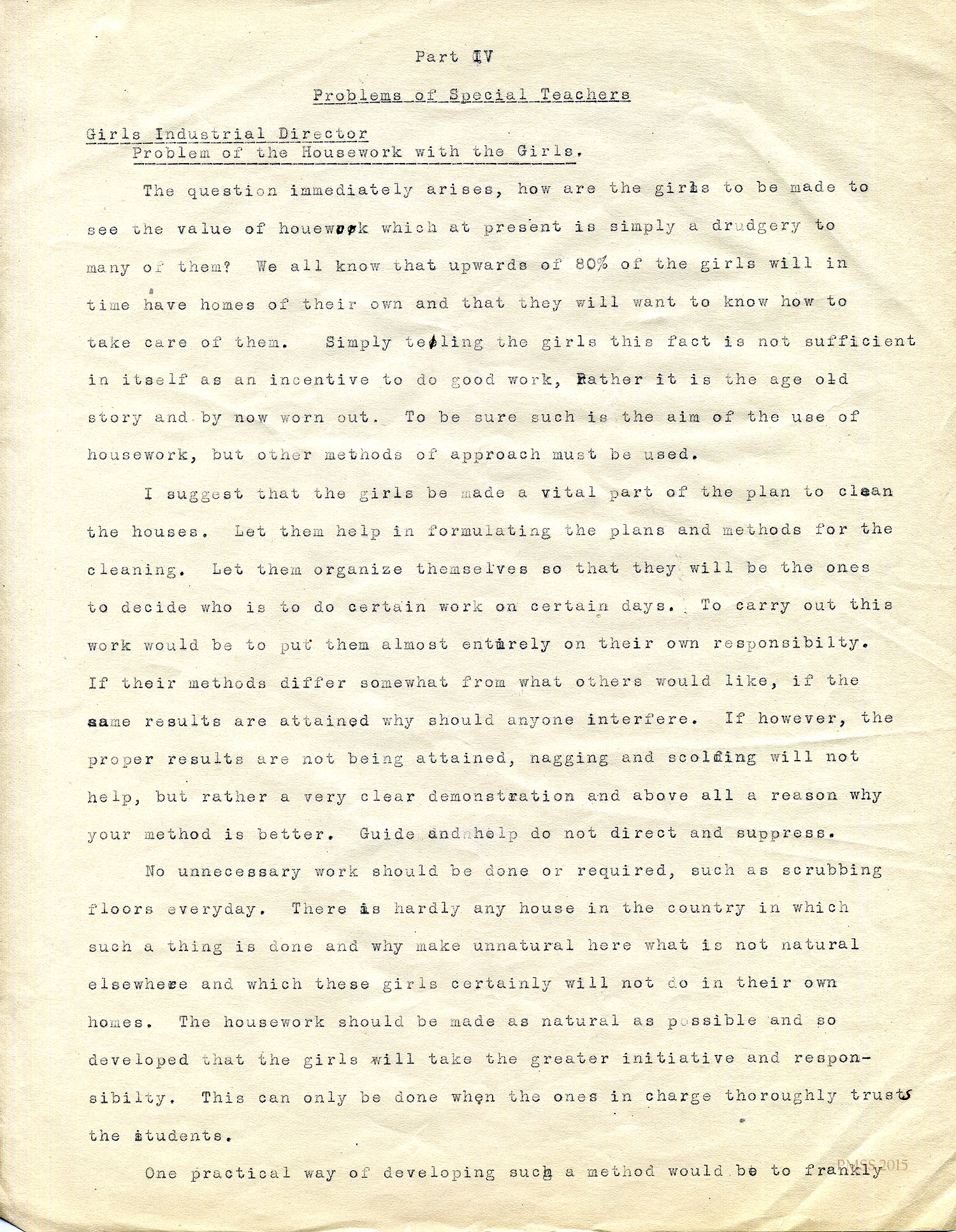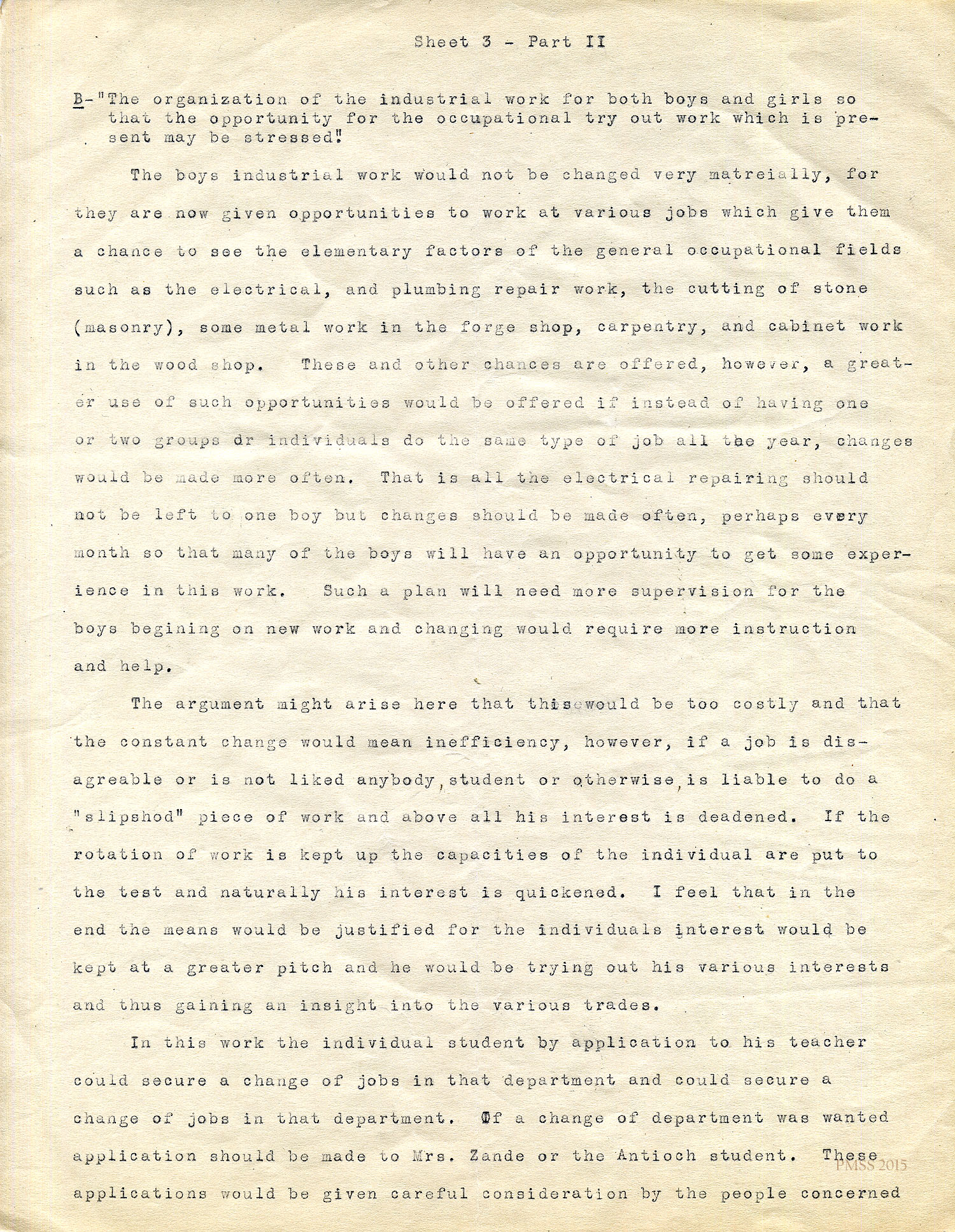The following industrial education plan was developed by Kendall T. Bassett in 1929 and represents the earliest comprehensive plan for vocational training or industrial education at the School. Bassett describes the purpose of the program: