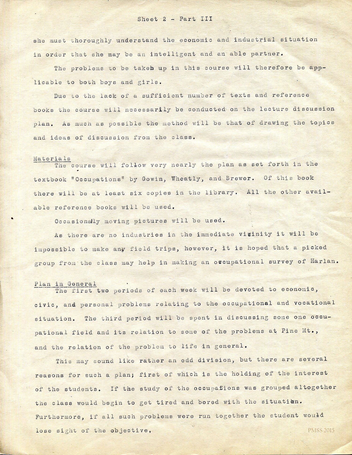 The children of this school come from districts in which there is little or no opportunity to observe or come in contact with a varied occupational or vocational life. Many of them go from here out of the mountains or into other regions where they come in contact with a very complex industrial and economic situation which is entirely foreign to them. It is the purpose of this plan to formulate a method which will aid the student in making this adjustment in a more intelligent and in an easier manner. This plan will also attempt to give these students a more intelligent conception of the opportunities in the industrial and professional life of today in which they might possibly enter.