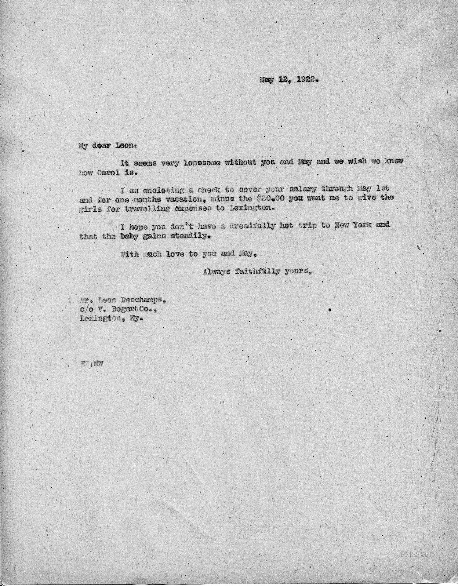 [unsigned] “E?”, probably Ethel Zande, to Leon, c/o V. Bogart Co., Lexington, KY: Lonesome without you and May; Carol; encloses salary check.