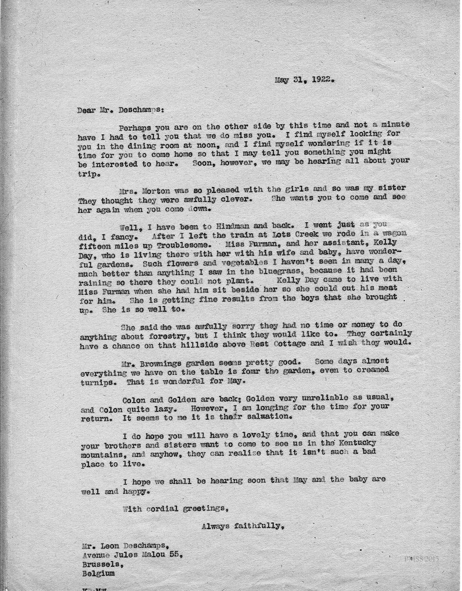 TAGS: Leon Deschamps correspondence, Pine Mountain Settlement School, May Ritchie, Ritchie family, WWI, Belgium, forestry, farming, agriculture, silviculture, industrial training, Katherine Pettit, William Browning, Ethel de Long Zande, Luigi Zande, Carol Deschamps, Mr. Manning, Evelyn Wells, Elizabeth Hench, George Peabody College, Bognert Bros., Mrs. John C. Campbell, Perfect Acre, John C. Campbell Folk School, Hubert Hadley, Glyn Morris, reservoir, Darwin D. Martin, (Mary Rockwell) Hook, Mildred Mahoney