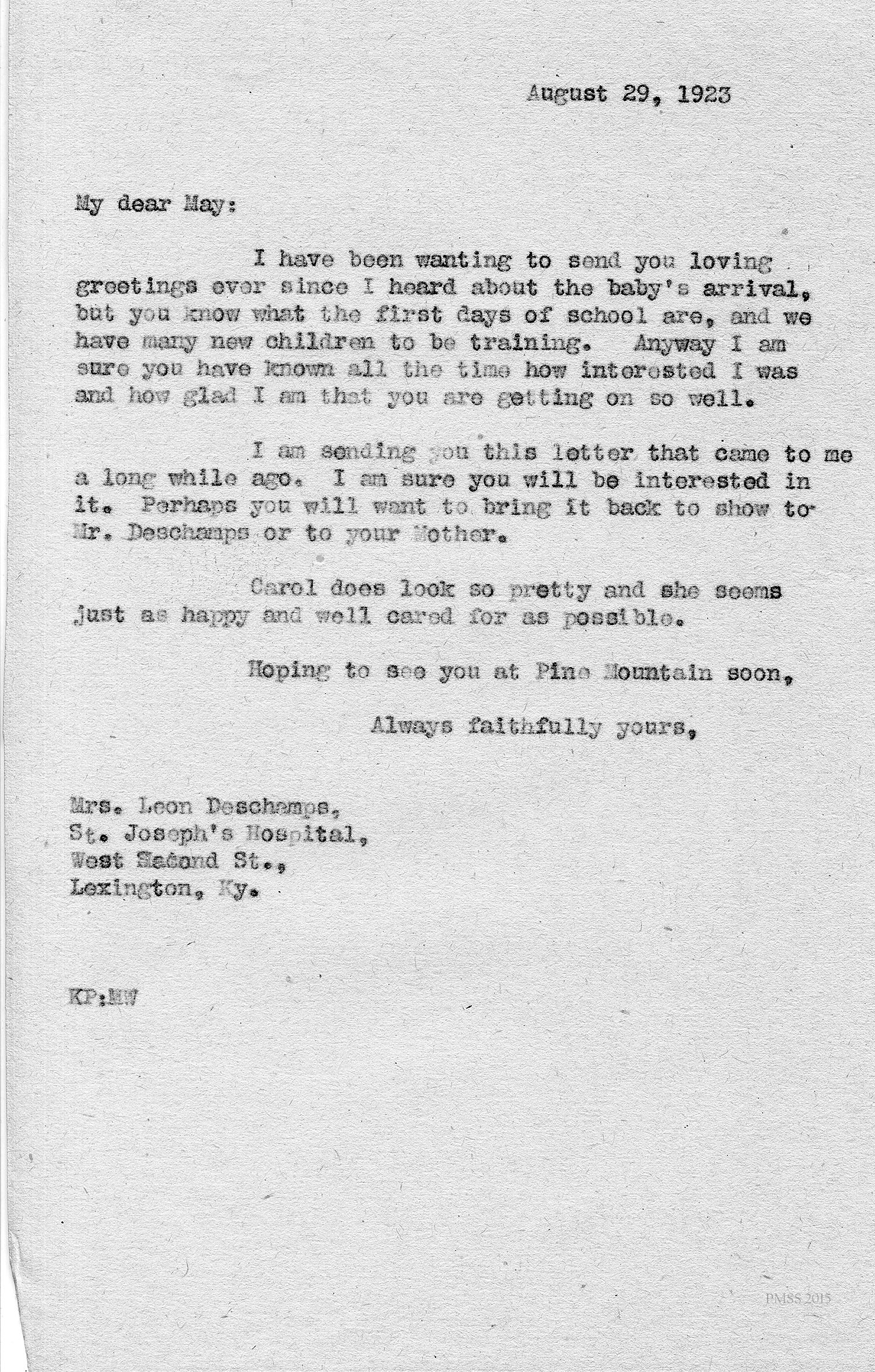 [unsigned] “KP” (Pettit) to May (Deschamps) at St. Joseph’s Hospital in Lexington, KY: Greetings to you and new baby; encloses a letter; Carol is well cared for.