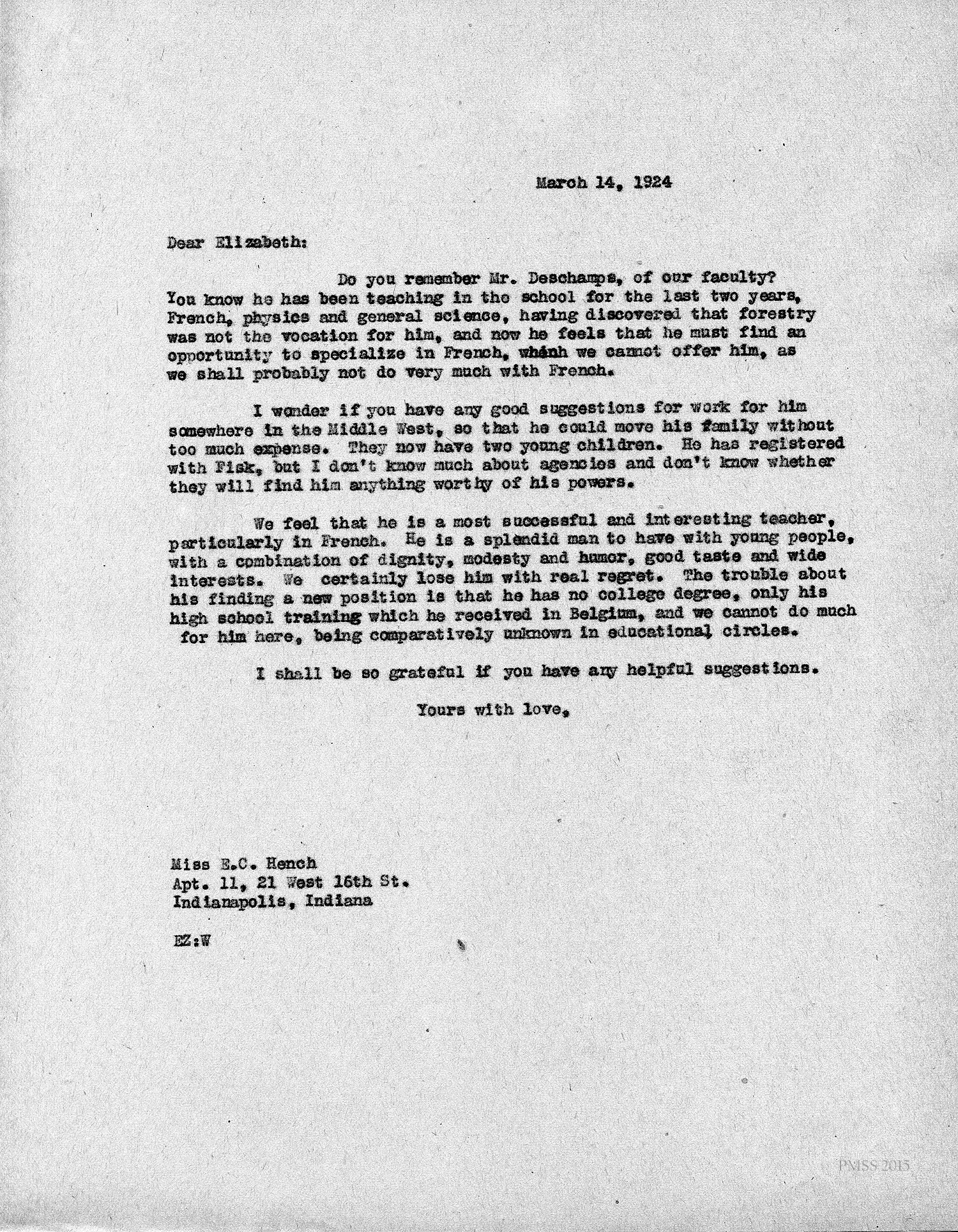 [unsigned] “EZ” (Ethel Zande) to Rebecca R. Mack in Chicago, IL: Asks for suggestions for young man (Deschamps) who has been teaching French, and science at PMSS and wants to get ahead professionally; describes his credentials; Miss (Evelyn) Wells sorry to miss talking at the Faulkner School in Chicago.