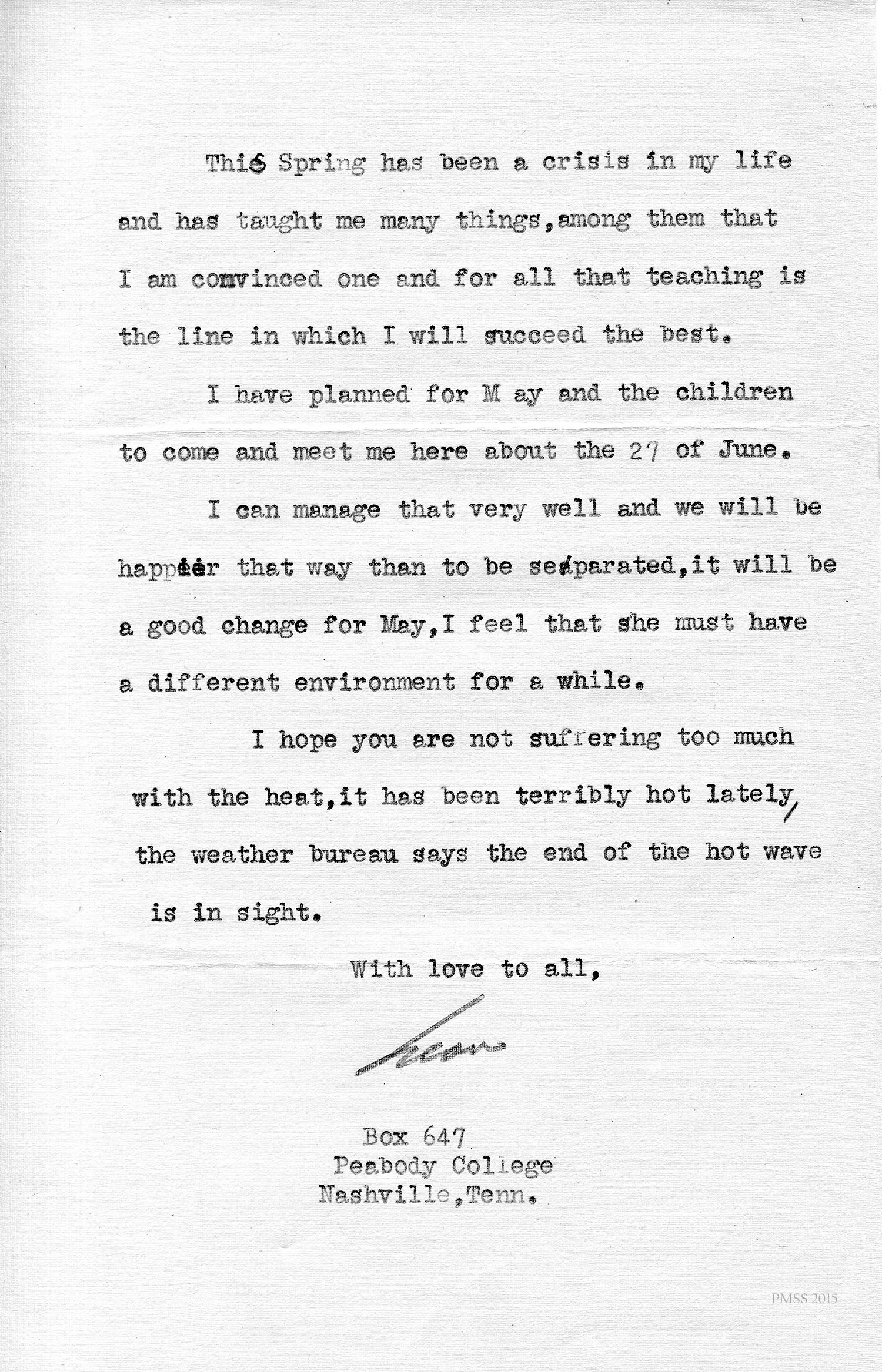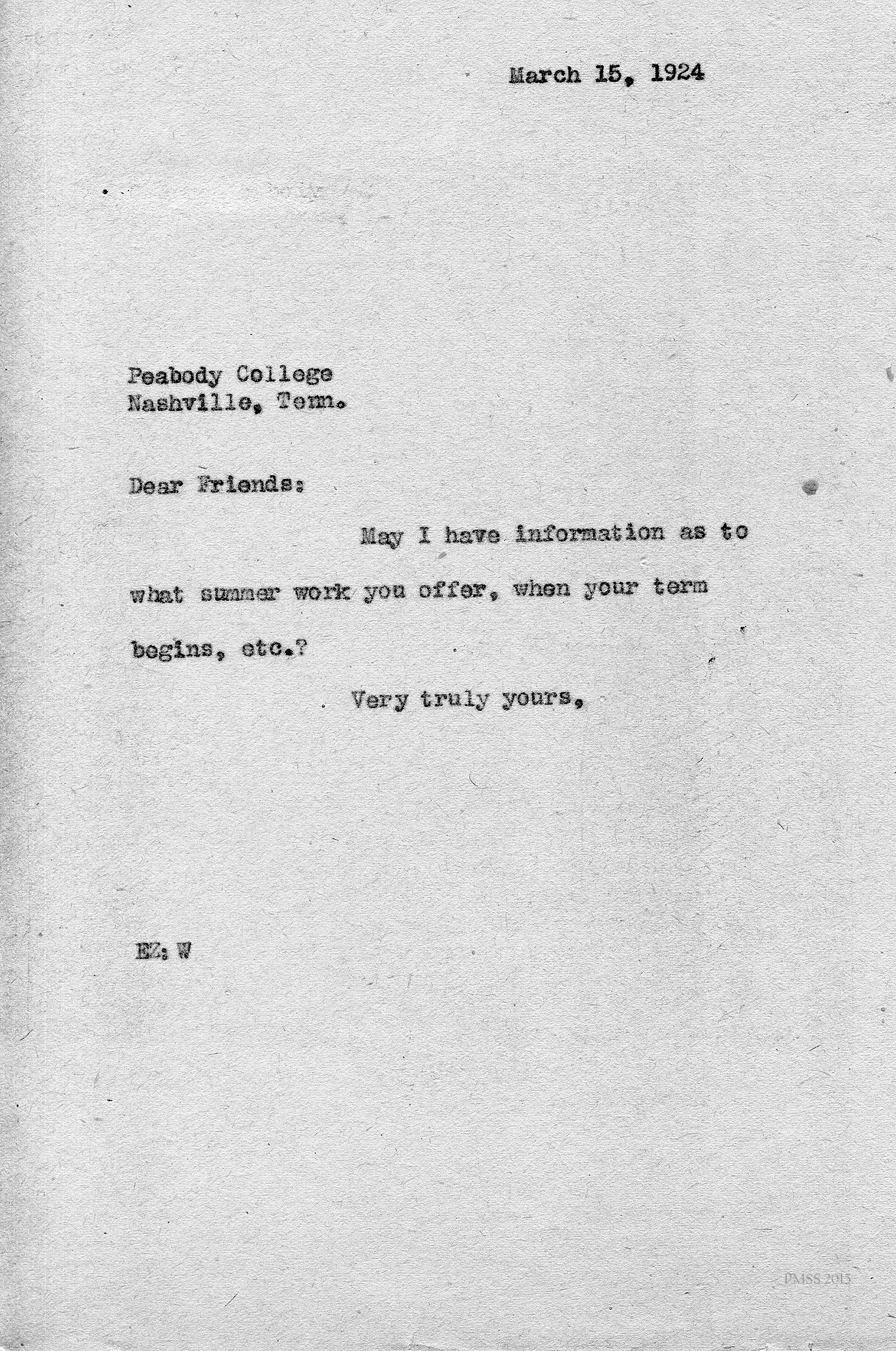 [unsigned] “EZ” (Ethel Zande) to “Friends” at Peabody College, Nashville, TN: Asks for information.