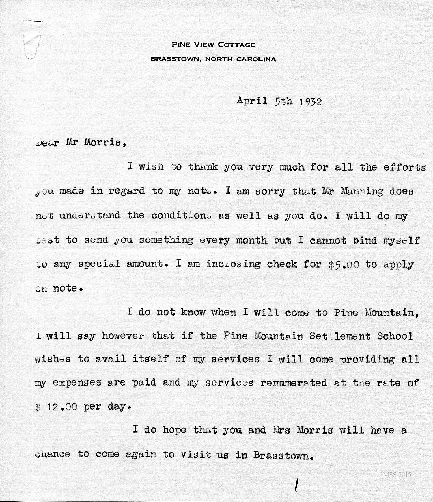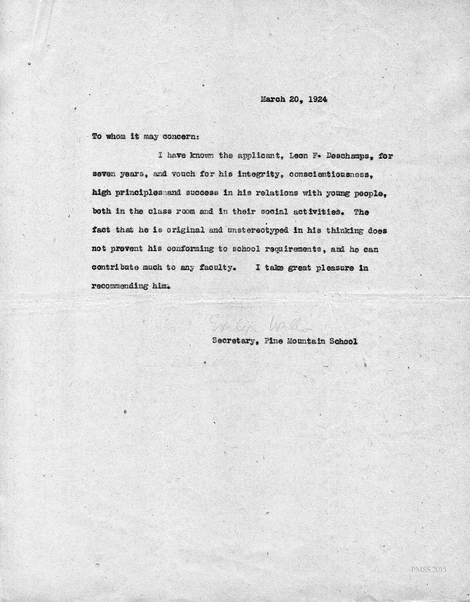 Evelyn Wells, Secretary, Pine Mt. School “to whom it may concern”: Draft letter of recommendation for Deschamps.