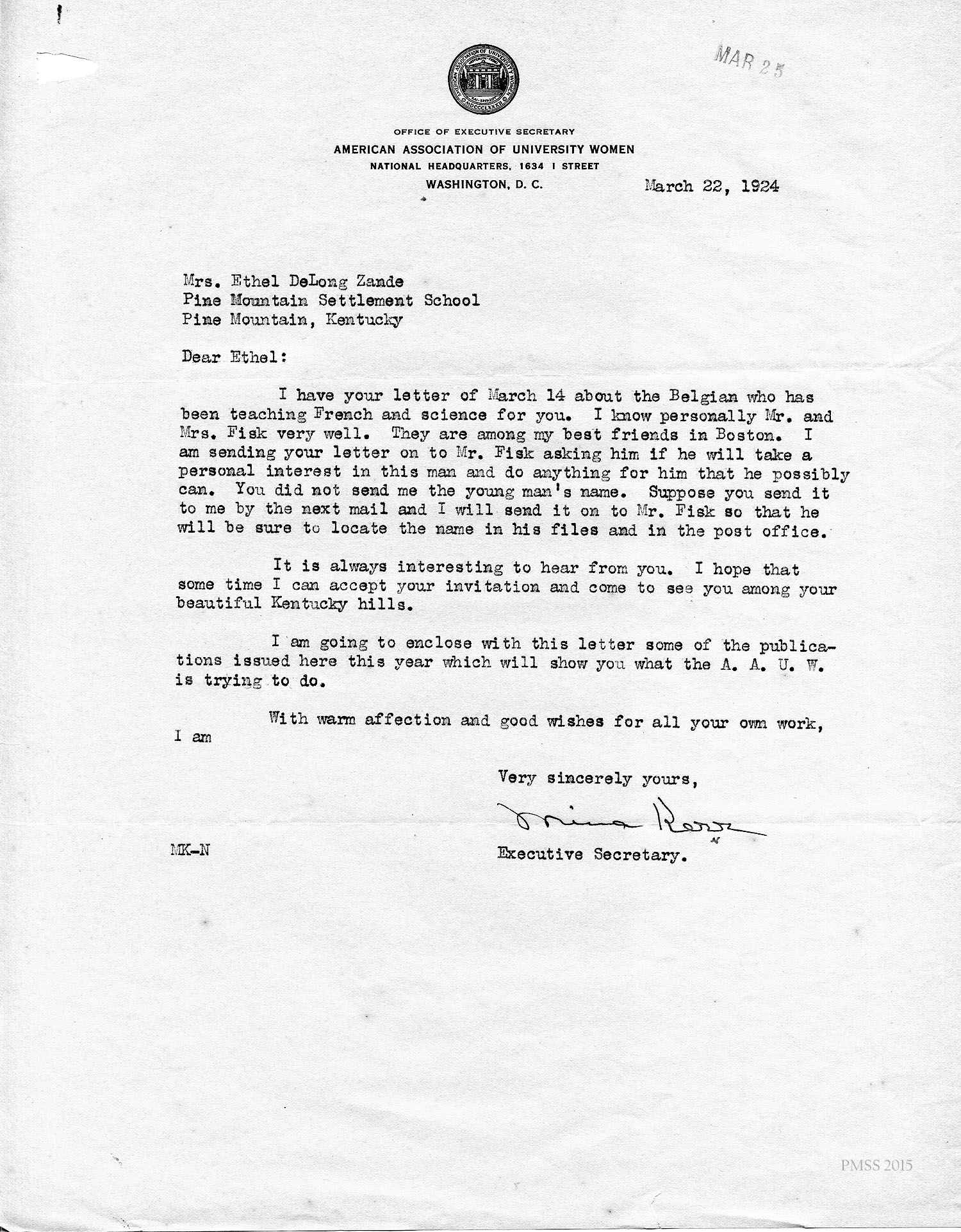 Mina Kerr, Exec. Secy., American Association of University Women in Washington, DC, to “Ethel” (DeLong Zande): Responding to March 14 letter: Will forward Deschamps’ name to Mr. Fisk, whom she knows well; AAUW information.