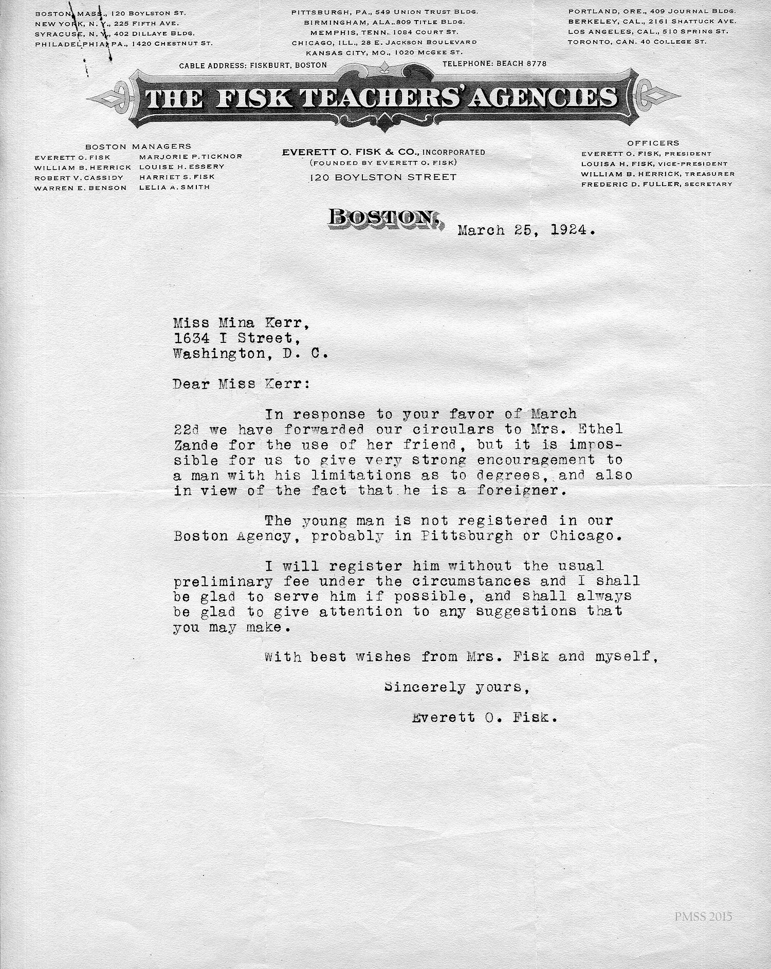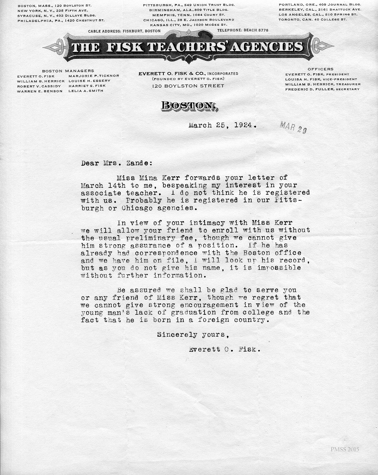 Everett O. Fisk to Mrs. Zande: Received copy of Zande’s letter from Miss Kerr; will waive Deschamps’ registration fee; cannot give strong encouragement because of his lack of a college degree and that he is “born in a foreign country.”