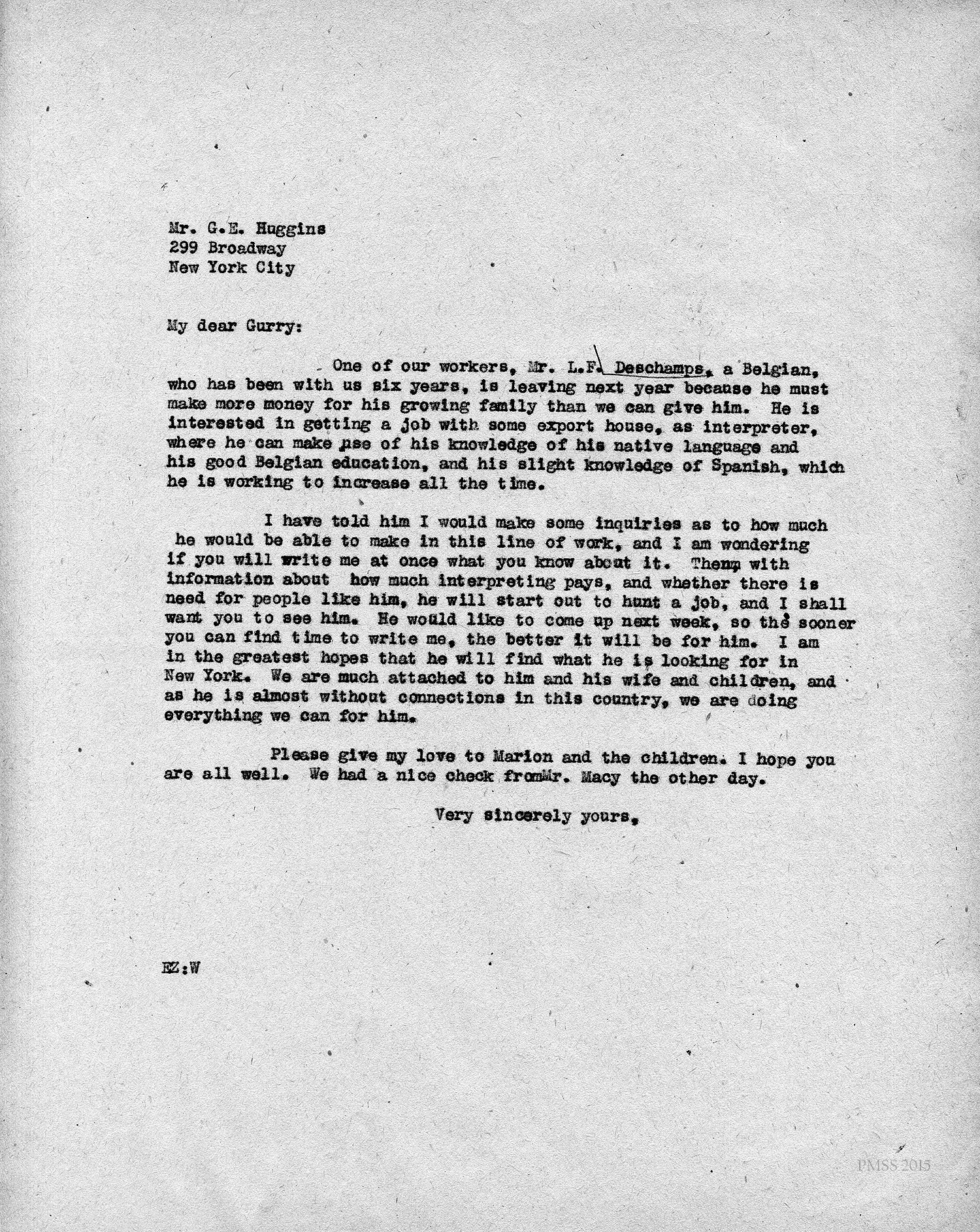 [unsigned] “EZ” (Ethel Zande) to “Gurry” (G.E. Huggins, NYC): Introduces Deschamps and asks for information about working in an export house as an interpreter.