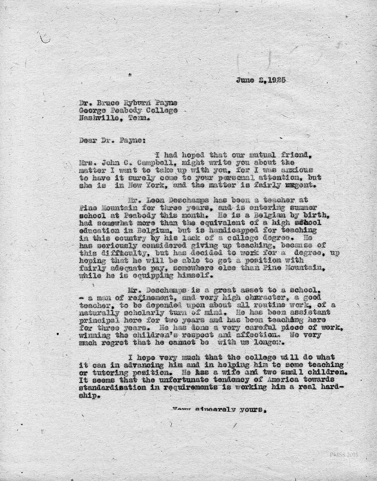 “Leon” (Deschamps) from Peabody College, Nashville, TN, to Zande: Will work for a degree and stay in teaching: Still interested in staying at Pine Mt.