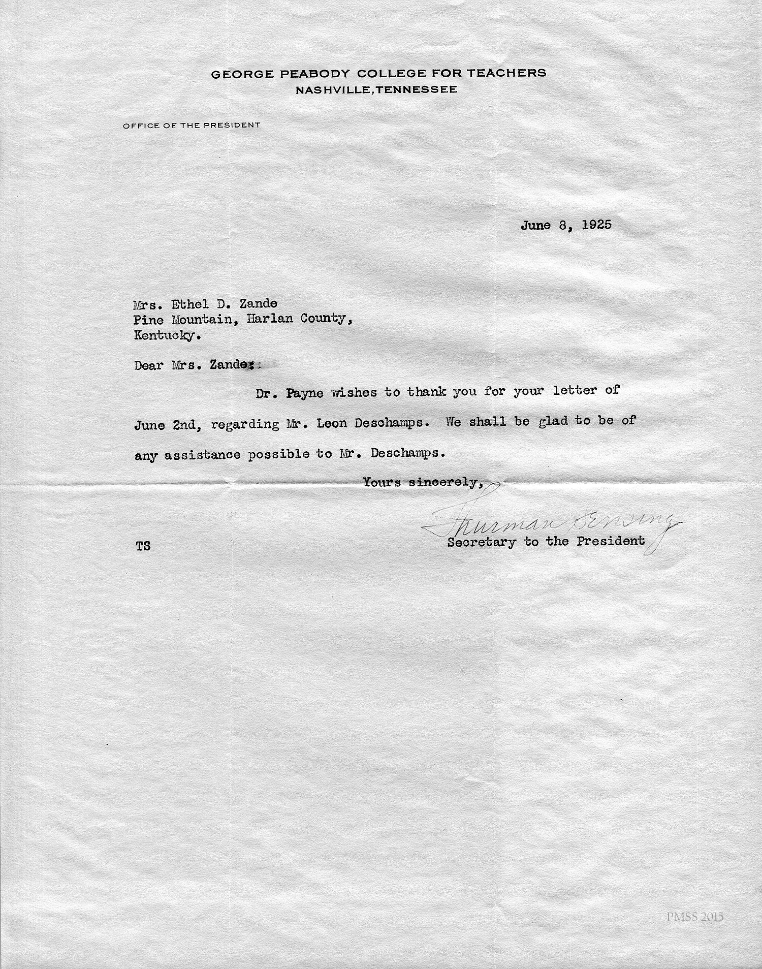 Secretary to the President, George Peabody College to Zande: Acknowledging her letter; will be of any assistance possible to Mr. Deschamps.