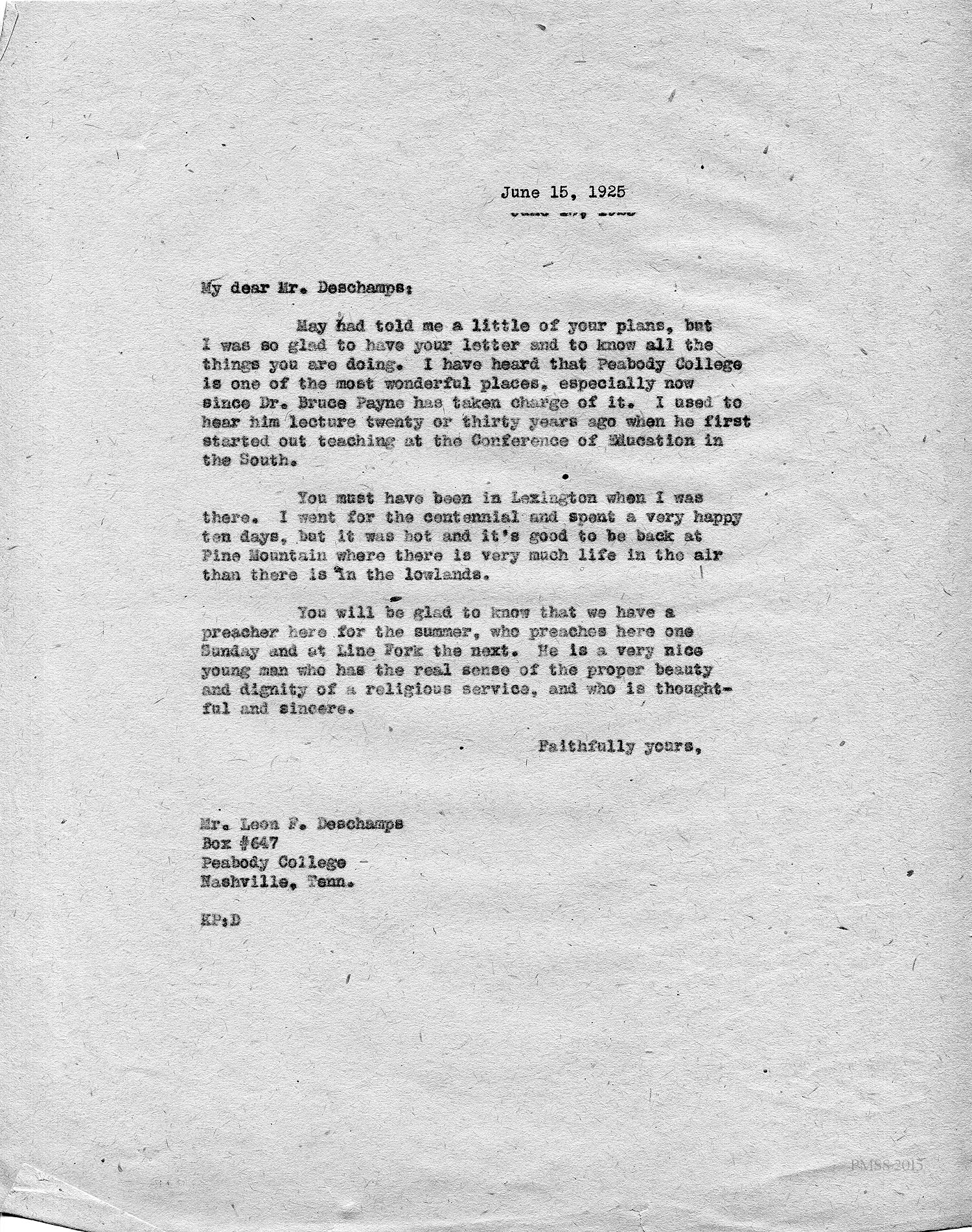 [unsigned] “KP” (Katherine Pettit) to Deschamps: Mentions her memories of Dr. Bruce Payne; PMSS has new preacher.