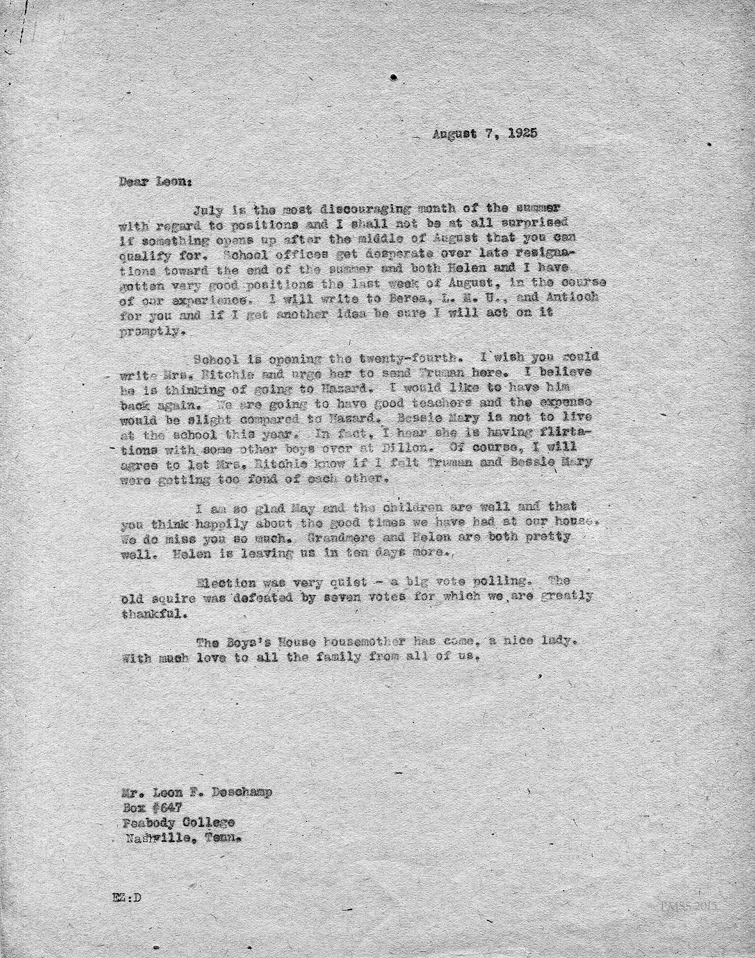 [unsigned] “EZ” (Ethel Zande) to “Leon”: Job search results may improve in August; Mrs. Ritchie; Truman; Bessie Mary; election; Boy’s House housemother has arrived.