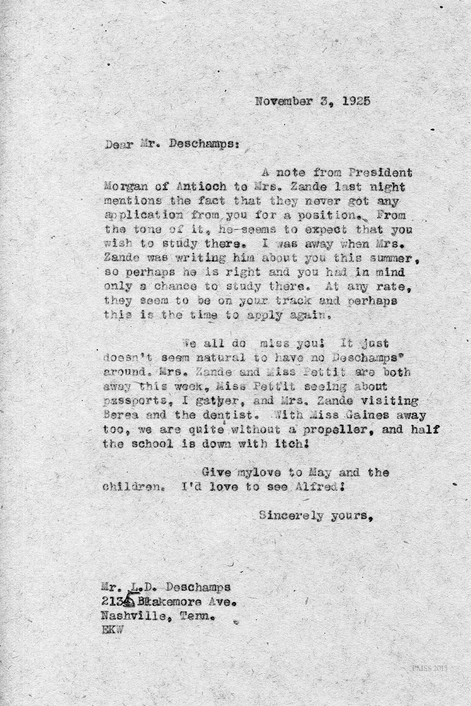 [unsigned] “EKW” (Evelyn K. Wells) to Deschamps: Received note from President Morgan of Antioch to Mr. Zande asking about Deschamps studying there.